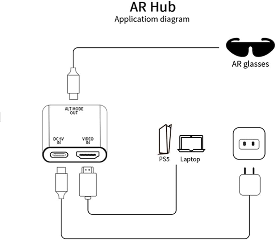 متطلبات الطاقة: للتأكد من أن الشاشات المحمولة أو نظارات AR تعمل ، يجب أن يتم تشغيل المحول من خلال منفذ USB-C المسمى "DC 5V in". استخدم كابل طاقة USB المضمون لهذا الغرض.