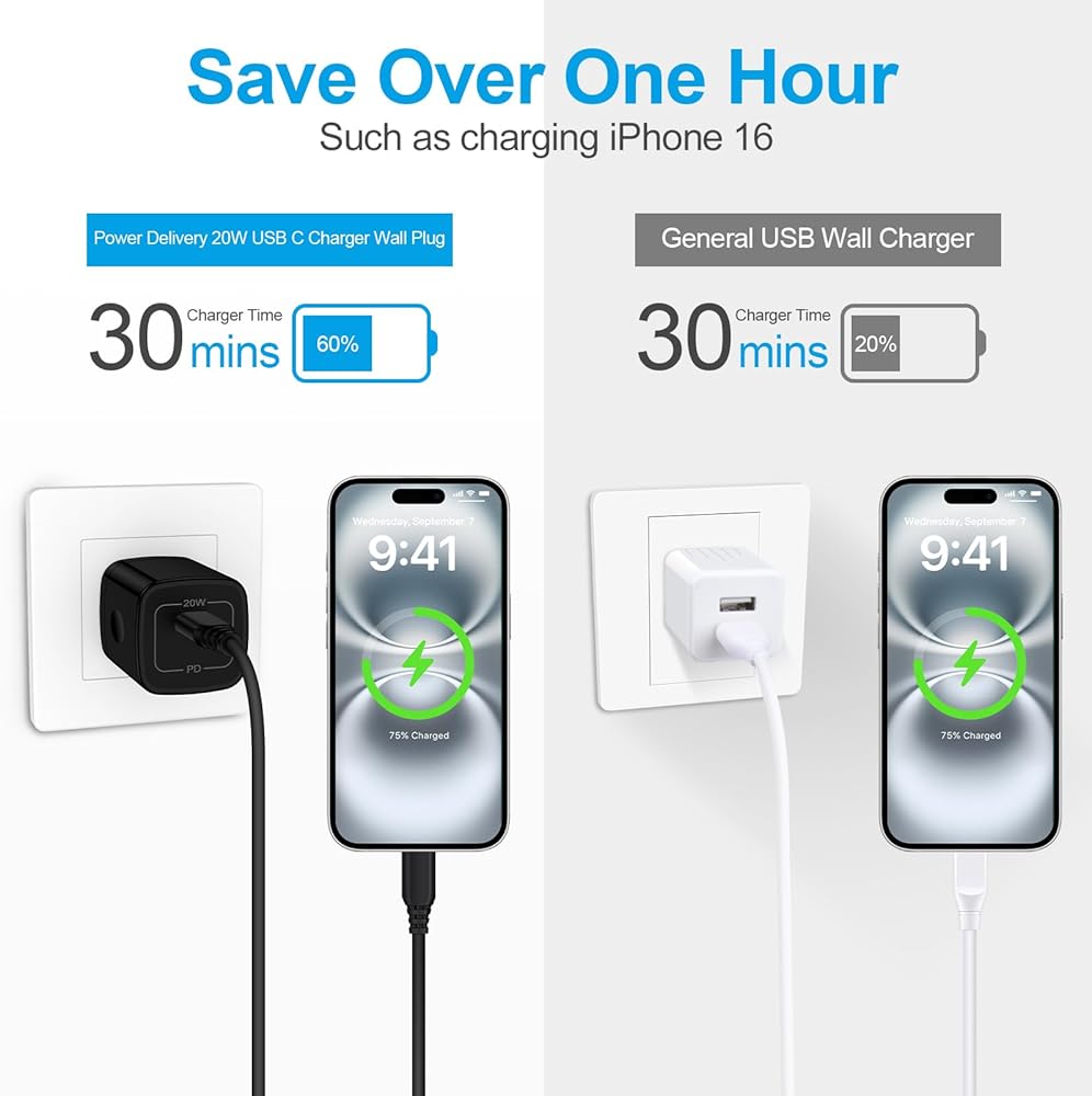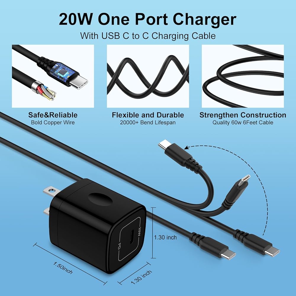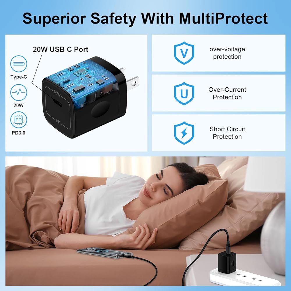 ①Powered by PD 3.0 fast charging technology, the USB C charger can provide up to 20 watt charging current to your device.