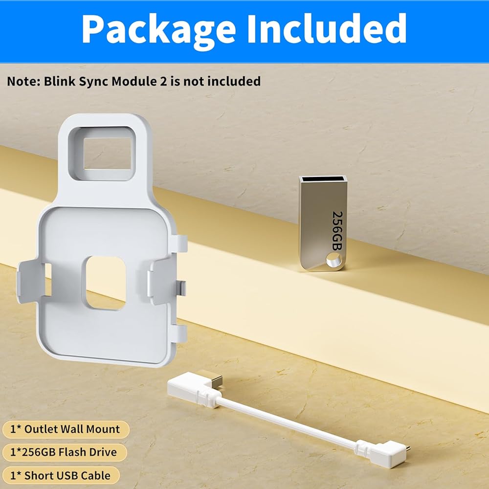 • The package include: 1* Blink USB Flash Drive (256 GB), 1* Outlet Mount for Blink Sync Module 2, 1* Short Cable. Should you encounter any difficulties, please do not hesitate to reach out to us