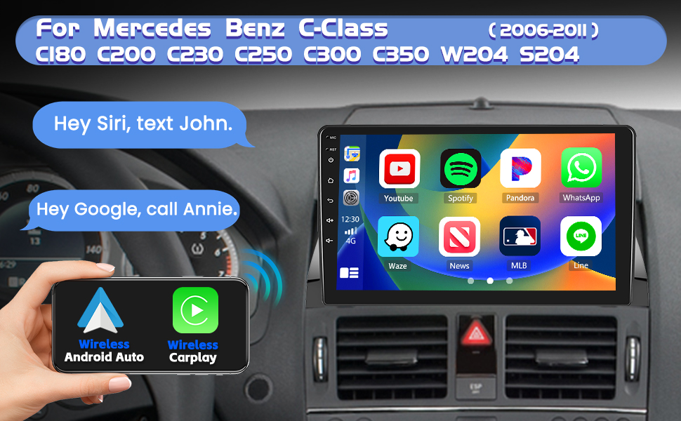 ستيريو السيارة مع iOS Carplay & Android Auto: بالنسبة إلى مرسيدس Benz C250 المعلومات والترفيه مع الشاشة التي تعمل باللمس واللعب اللاسلكي/السلكي المدمج ، والاستدعاء اللاسلكي/السلكي للسيطرة على مداعبة صوتية فائقة وسهولة الوصول إلى ميزات هاتفك ، بما في ذلك الموسيقى ، والتنقل ، والمكالمات ، والمكالمات ، الإخطار والرسائل وأكثر من ذلك بكثير (يتم تقييد بعض هواتف Samsung)