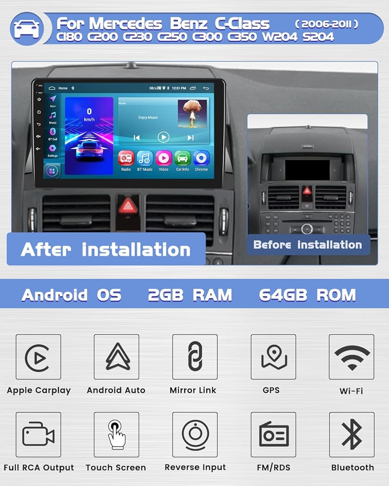 Radio Bluetooth & FM/RDS Radio: بالنسبة إلى Mercedes Benz C180 Android Head Unit مع MIC مدمج وخارجي (بما في ذلك الميكروفون) ، ودعم المكالمات الخالية من اليدين ، وتشغيل الموسيقى ، ووظائف الصوت ، واتصالات متزامنة ، إلخ. ، يدوي ، شبه تلقائي ، البحث الأوتوماتيكي بالكامل. يوفر راديو FM/RDS عالي الجودة البث القنوات وتوقعات الطقس وظروف الطريق في الوقت الفعلي