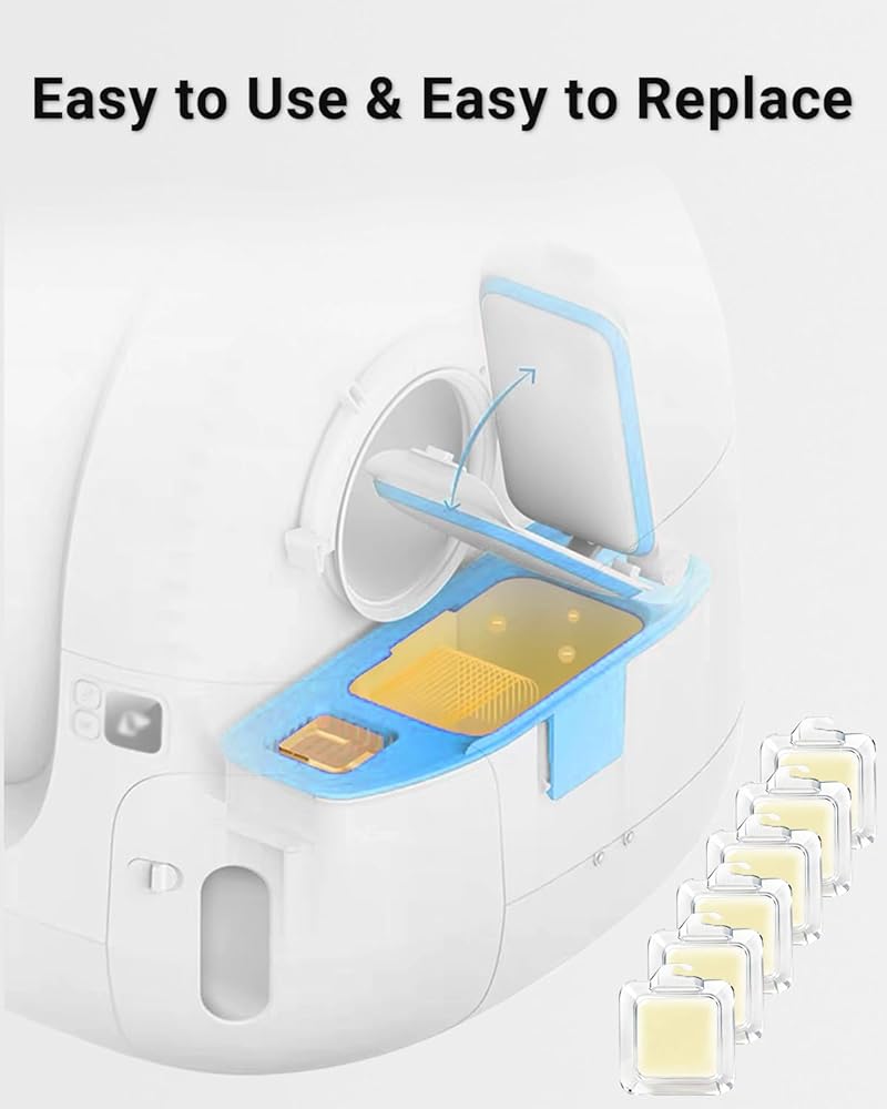 • من السهل الاستخدام - استبدال مزيل الرائحة في صندوق التنظيف الذاتي هو نسيم! ما عليك سوى سحب درج صندوق القمامة الأوتوماتيكي ، وضعه في التحكم في رائحة القطط ، وأنت مستعد للتغيير