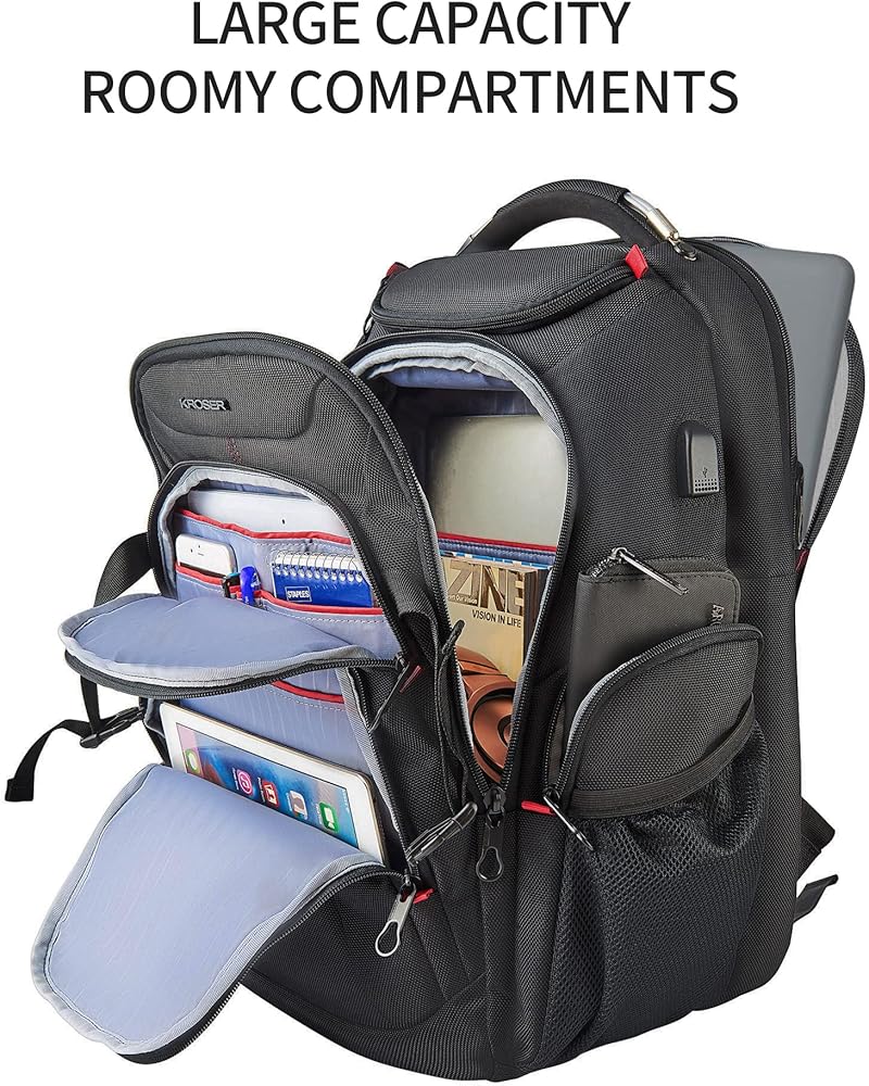 حقيبة ظهر للكمبيوتر المحمول للسفر مقاس 17.3 بوصة مقاس XL من KROSER مع جيوب صلبة لغرفة الأمان RFID وجيوب RFID طاردة للماء حقيبة كمبيوتر محمول أنيقة للرجال والنساء باللون الأسود