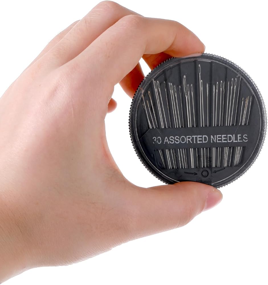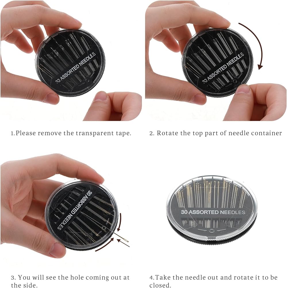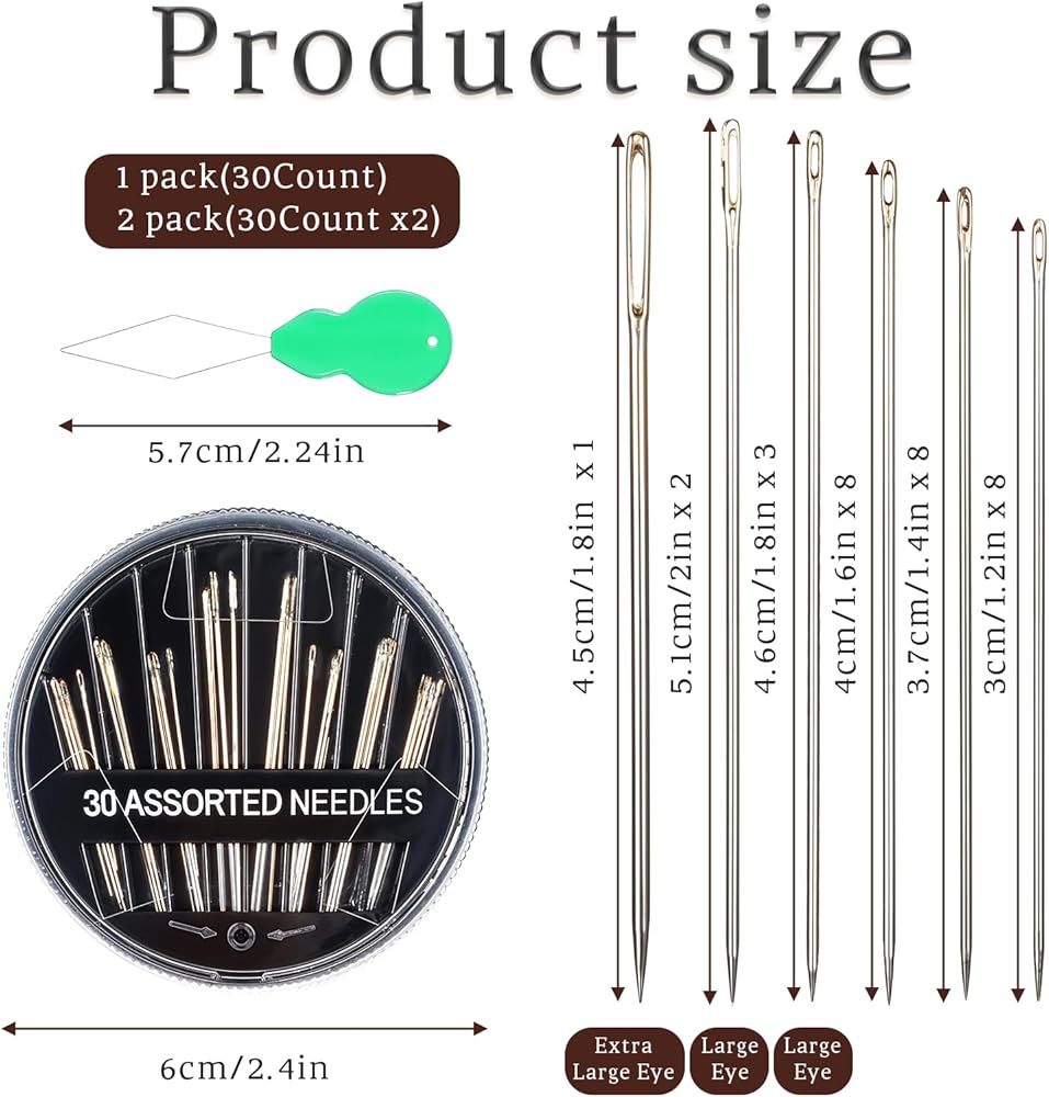 Product size: needle 1pc: 4.5cm/1.8in, 2pcs: 5.1cm/2in, 3pcs: 4.6cm/1.8in, 8pcs: 3cm/1.2in, 8pcs: 3.7cm/1.4in, 8pcs: 4cm/1.6in; threader is about 5.7cm/2.24in long