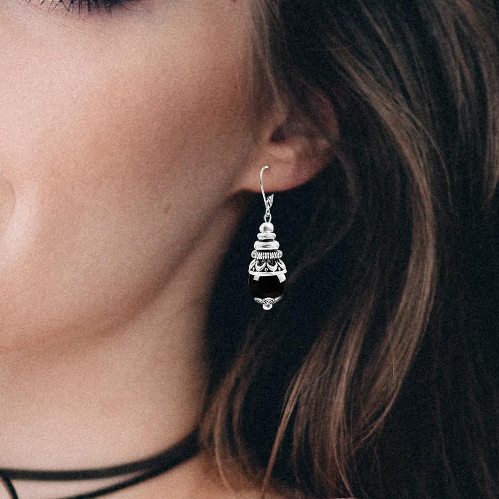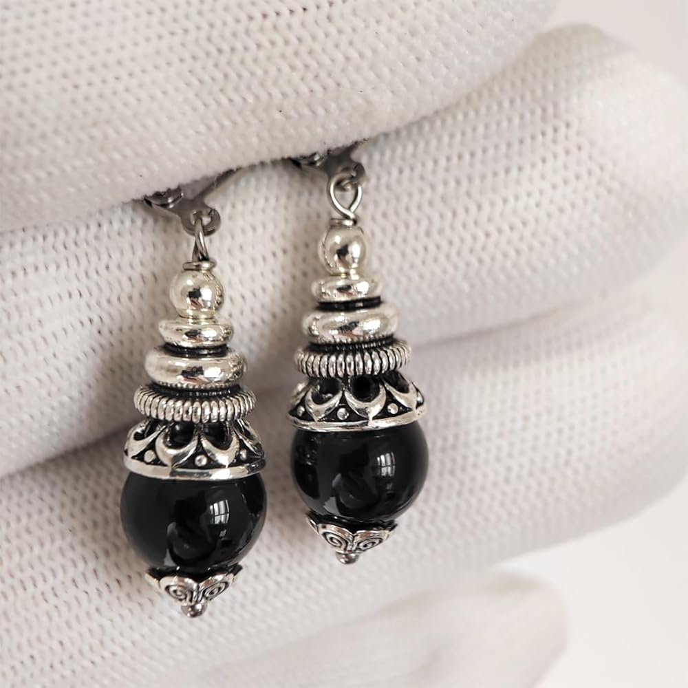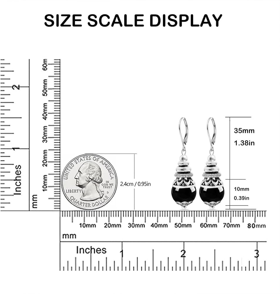 【Material&Size】Thick silver plated,Retro,round natural real Black Agate Stone.All the stone beads 10mm/0.39in,The earrings hooks size is about 15mm/0.59in.And the whole earrings is 35mm/1.38in.