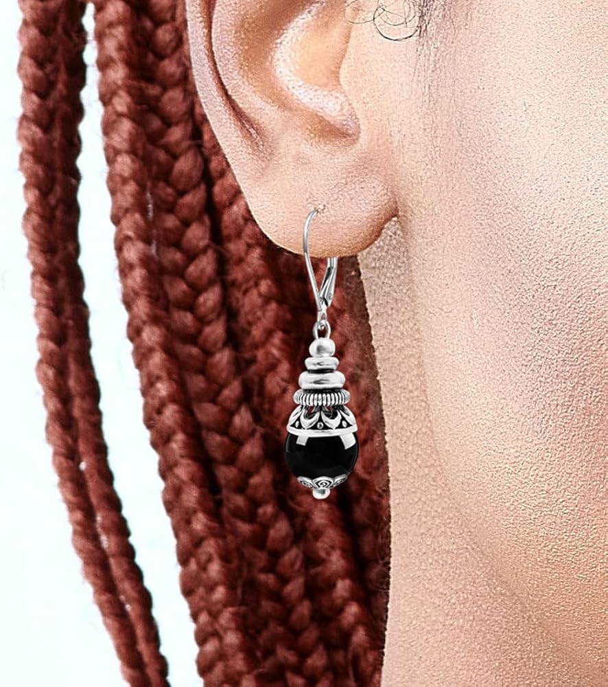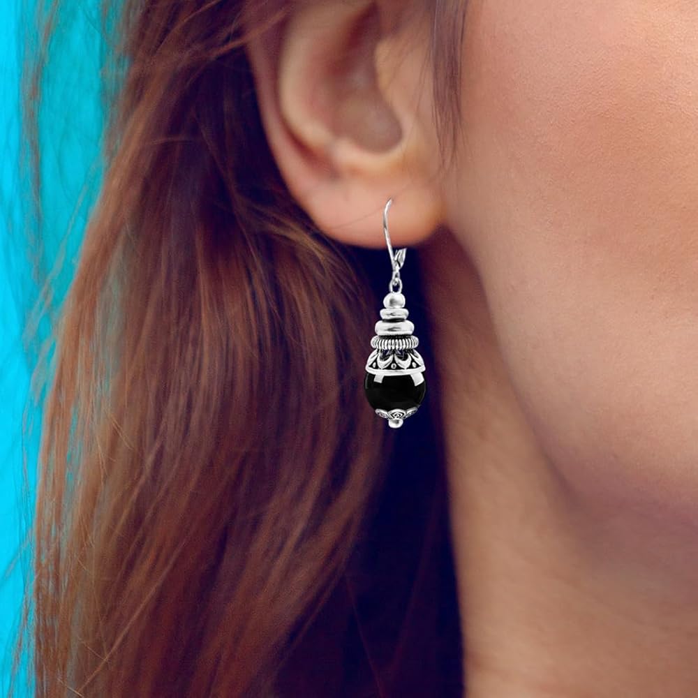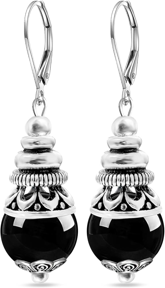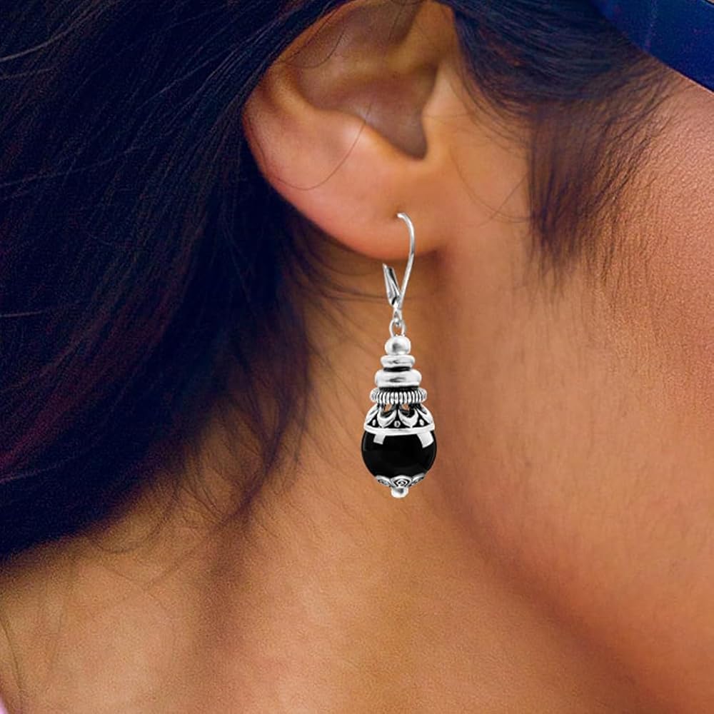 【Material&Size】Thick silver plated,Retro,round natural real Black Agate Stone.All the stone beads 10mm/0.39in,The earrings hooks size is about 15mm/0.59in.And the whole earrings is 35mm/1.38in.