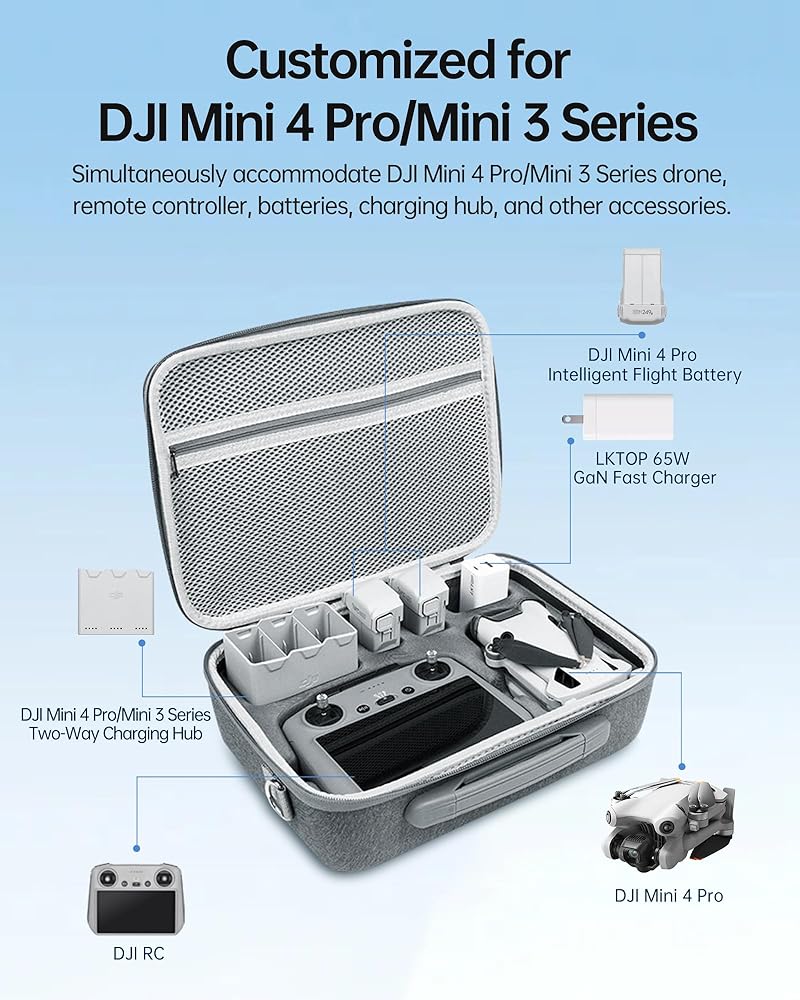 • 【Large Capacity】This Storage Travel Bag accommodates DJI Mini 3/Mini 4 Pro/Mini 3 Pro accessories including DJI Mini 4 Pro/Mini 3 Pro/Mini 3 Drone, DJI RC 2/RC/RC-N1/RC-N2/RC Pro Remote Controller, DJI Mini 4/3 Series Batteries, DJI Mini 4/3 Series Charging Hub, DJI / LKTOP Battery Charger, and propellers, keeping everything neat and organized.