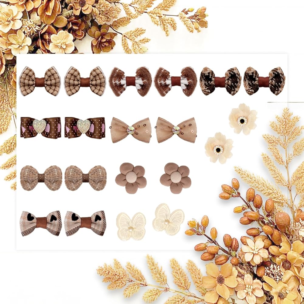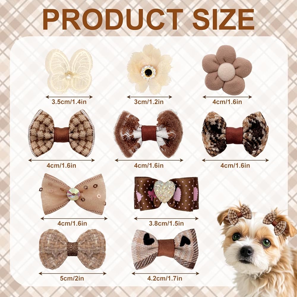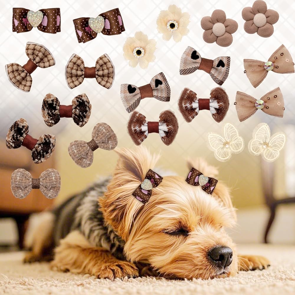Style:Brown Small Dog Hair Bows Cute Puppy Dog Bowknot Hair Bow Bulk with Rubber Bands Elastic Lace Rhinestone Pearls Hair Ties