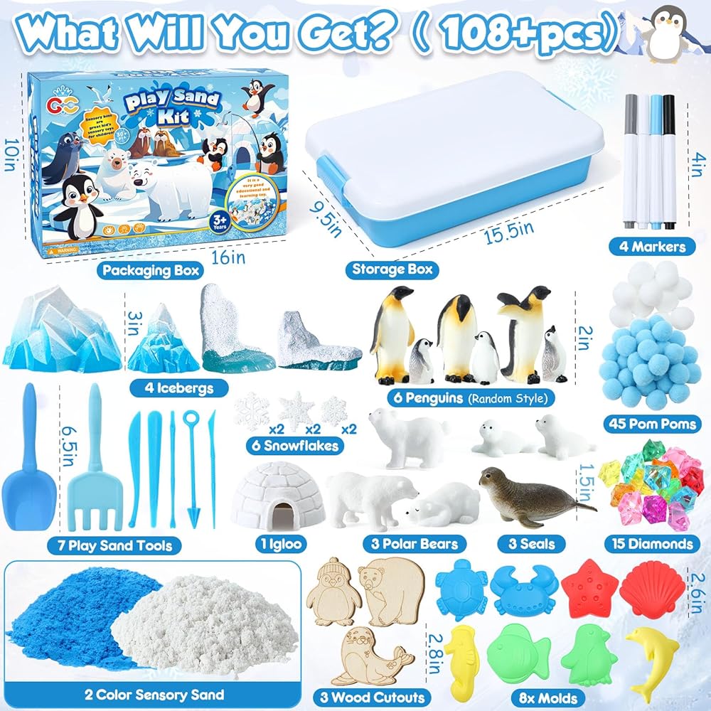 108pcs Arctic Sensory Bin Kit: Our polar theme play sand kit includes a sturdy storage box, 2 colors of sensory sand, 8 molds, 7 tools, 12 animal figures, pom-poms, crystals, wooden cutouts, 4 markers, snowflakes, icebergs, and an igloo. The sandbox with lid keeps playtime contained and mess-free, so you never have to worry about cleanup