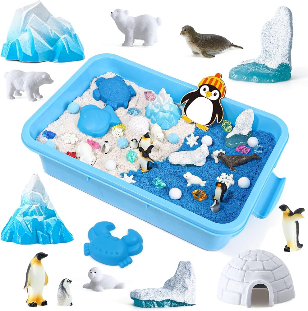 Winter Wonderland Play Sand: Our snow sensory bin toys feature 2 colors of sensory sand—white like a snowfield and blue like the ocean. The sand is self-sticking and non-drying, making it easy to shape and mold over and over again. With 8 fun molds, kids can create penguins, fish, and other underwater animals, adding to their Arctic scene