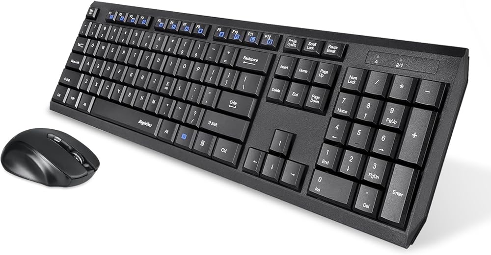 مجموعة لوحة مفاتيح وماوس لاسلكية Eagletec K104 رفيعة ومسطحة وهادئة، لوحة مفاتيح مريحة كاملة الحجم مكونة من 104 مفاتيح وماوس لاسلكي محمول لأجهزة الكمبيوتر التي تعمل بنظام Windows (مجموعة لوحة مفاتيح وماوس لاسلكية سوداء)