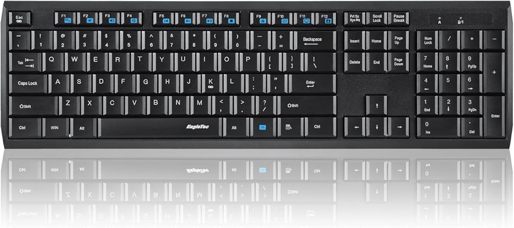 ERGONOMIC 104 KEY LOW PROFILE WIRELESS KEYBOARD; Full-size splash resistant Keyboard with Numeric Keypad and adjustable typing angle, Low-profile Keys Provide a Quiet, Comfortable Typing Experience 12 hot keys for instantly accessing your music, internet, e-mail, volume, and more