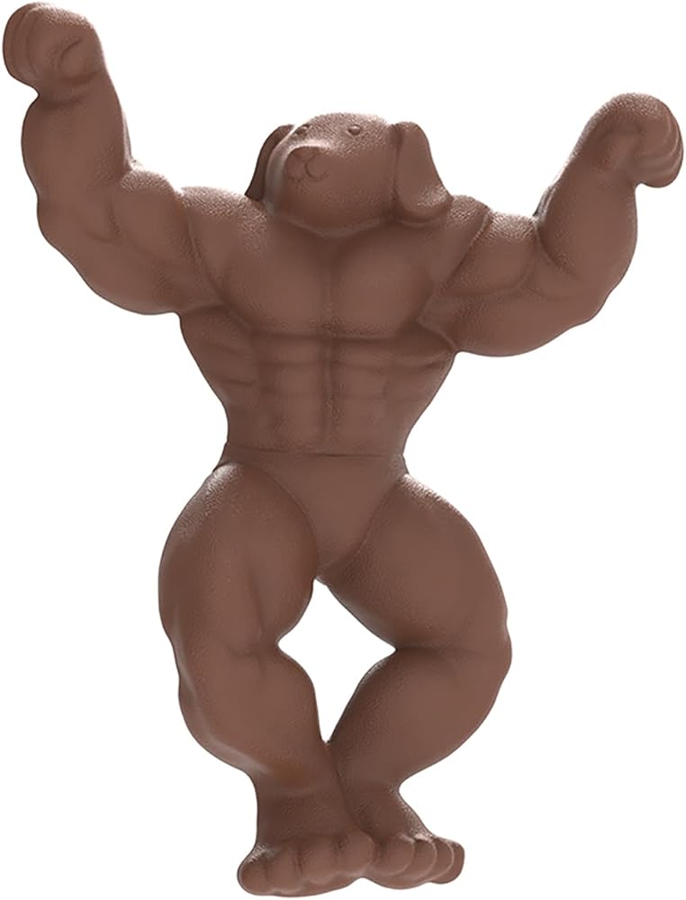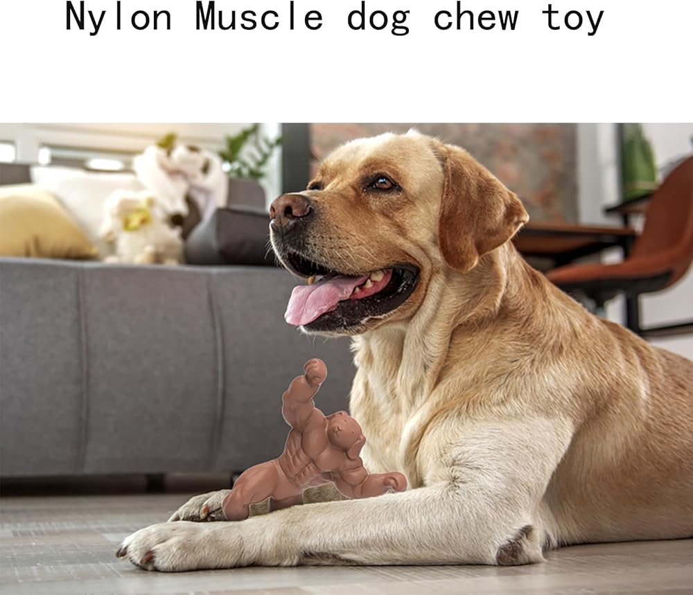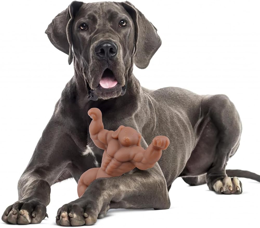 Dog Toy for Aggressive Chewers-This is a large tough chew toy in the shape of a muscle dog,it is supposed to be for aggressive chewers.Your dogs will enjoy the shape because the arms are easy for them to stick up in the air and really gnaw on.