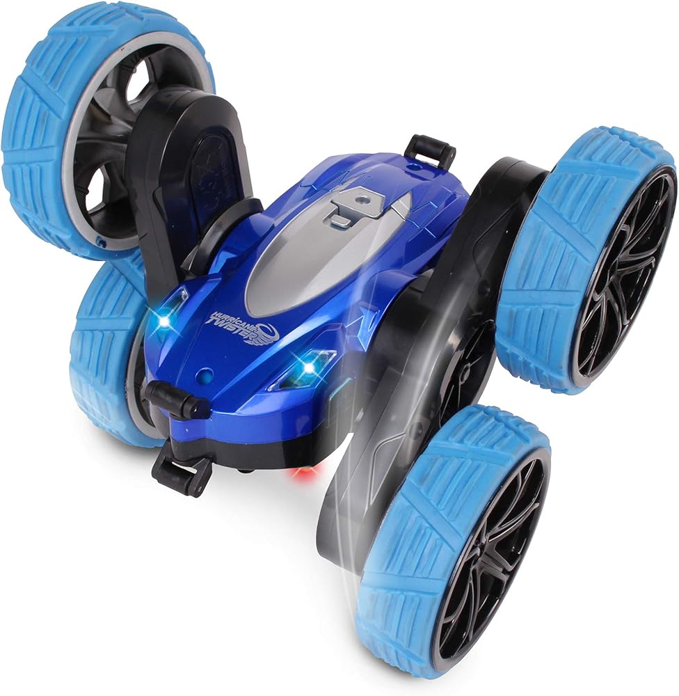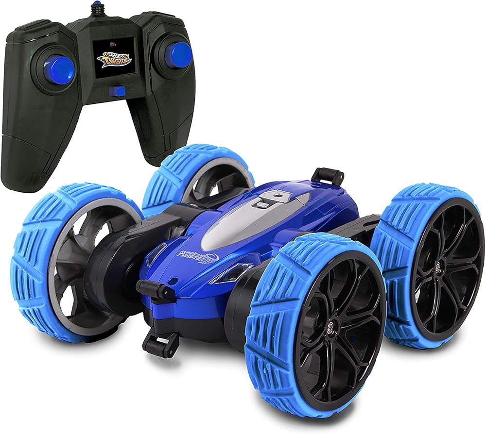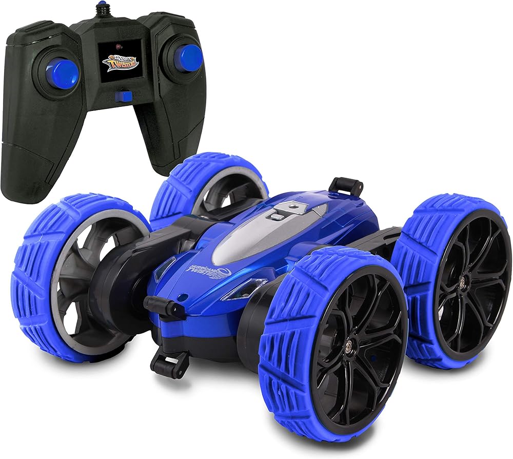 Stunt is NKOK's innovative brand of radio controlled stunt vehicles. Each one comes with unique features that allows for amazing tricks. The revolutionary Hurricane has 2 axles that spin independently. The tires are high quality, grippy and bouncy and the vehicle is two sided - two sides are better than one! Features bright LED lights, 360 degree spins, and flip stunts. Comes completely ready to run with a 3.7V Li-ion rechargeable battery, 2AA batteries, and USB charger cord.