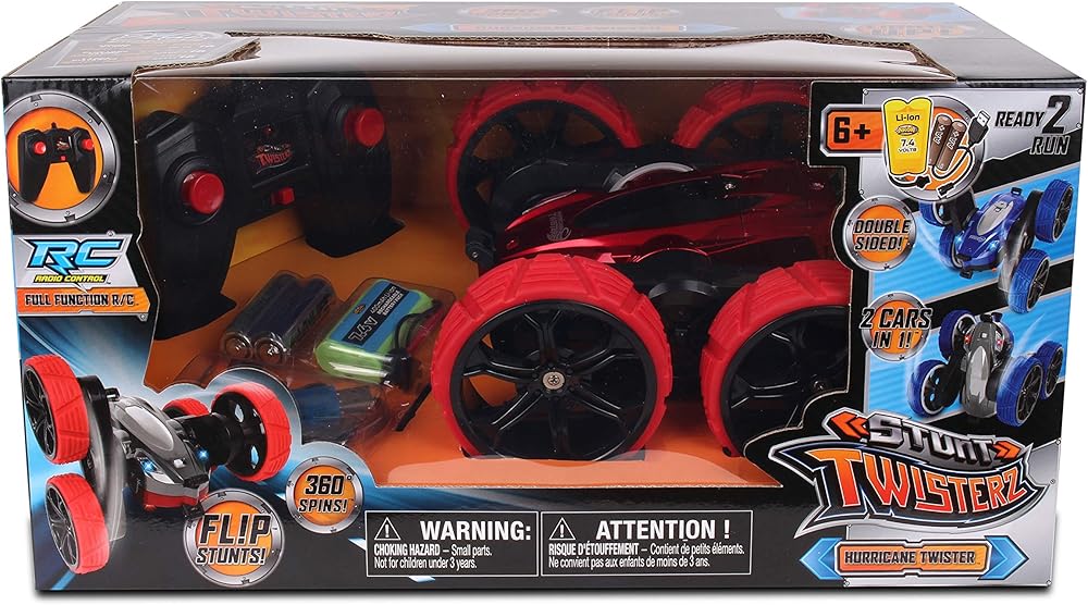• Stunt RC is NKOK's innovative brand of radio controlled stunt vehicles. Each one comes with unique features that allows for amazing tricks. The revolutionary Hurricane RC has 2 axles that spin independently. The tires are high quality, grippy and bouncy and the vehicle is two sided - two sides are better than one! Features bright LED lights, 360 degree spins, and flip stunts. Comes completely ready to run with a 3.7V Li-ion rechargeable battery, 2AA batteries, and USB charger cord.