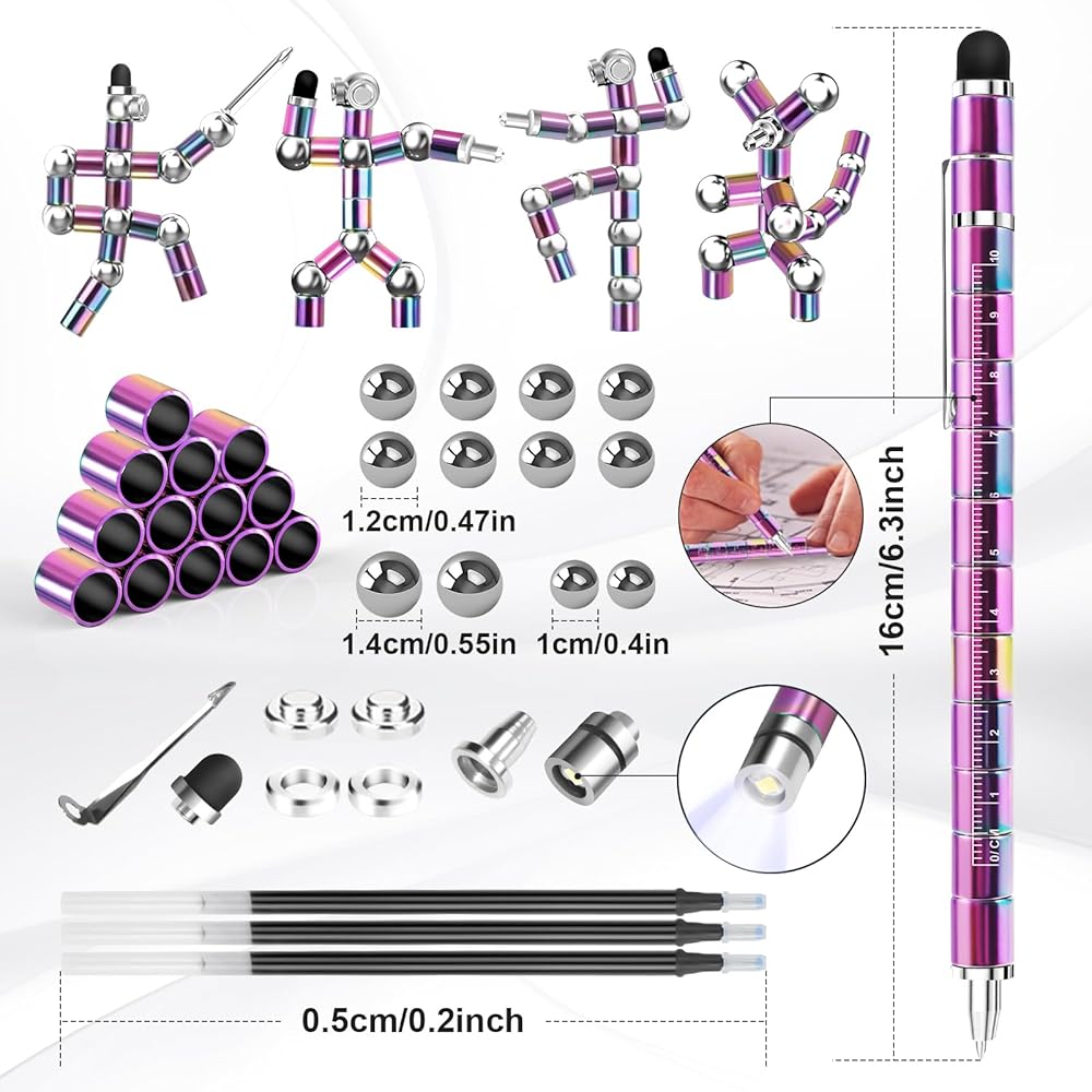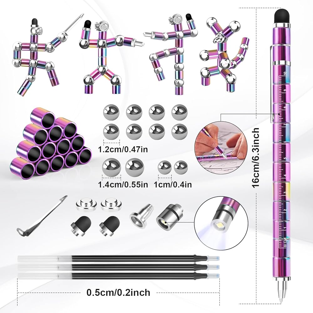 Multifunction Fidget Pen: This multifunction pen is more than just a pen, touchscreen pen, handy handle, ruler, LED light, it's also a finger fidget toy. It can be used as a toy to DIY and you can paste it on any iron object you like, such as an ipad