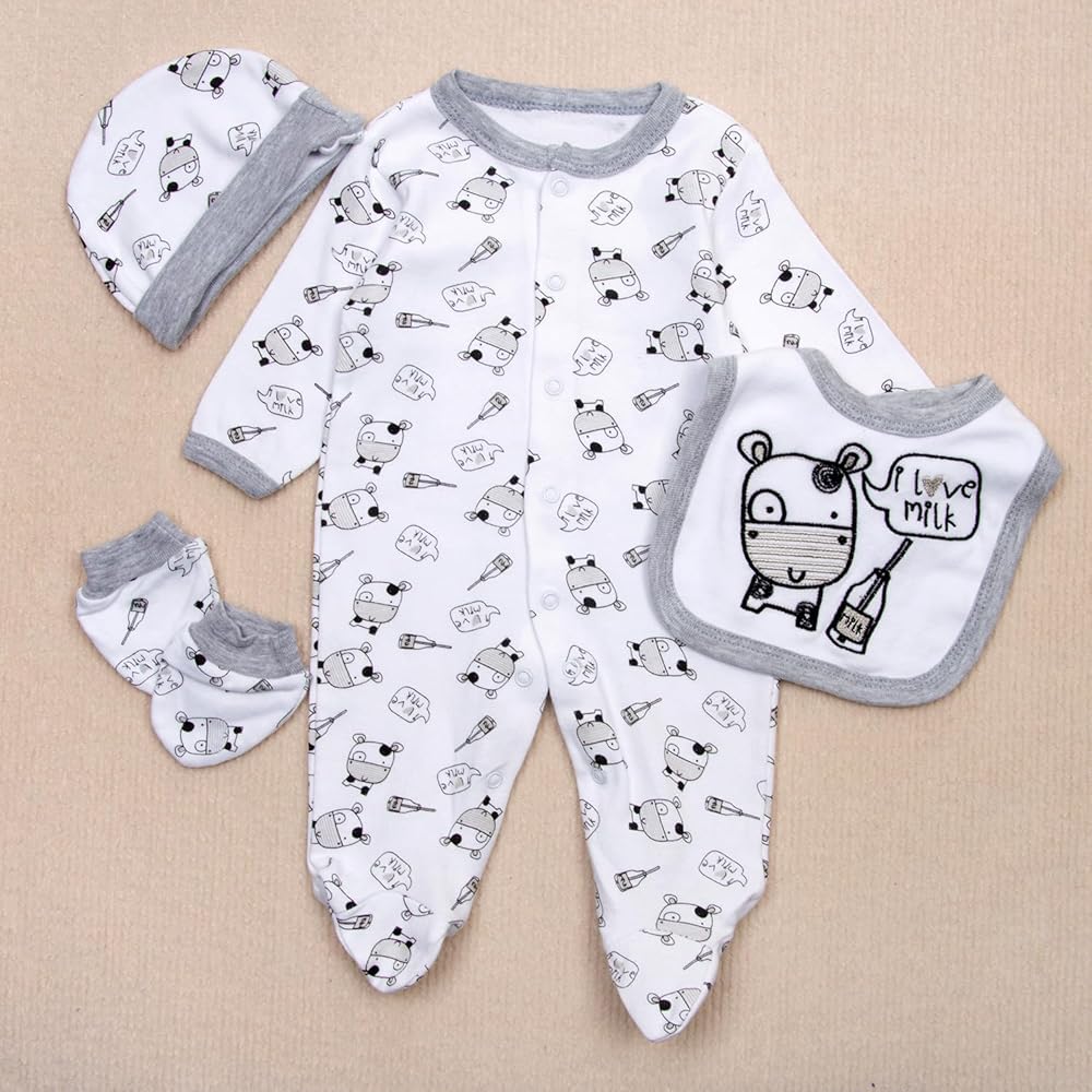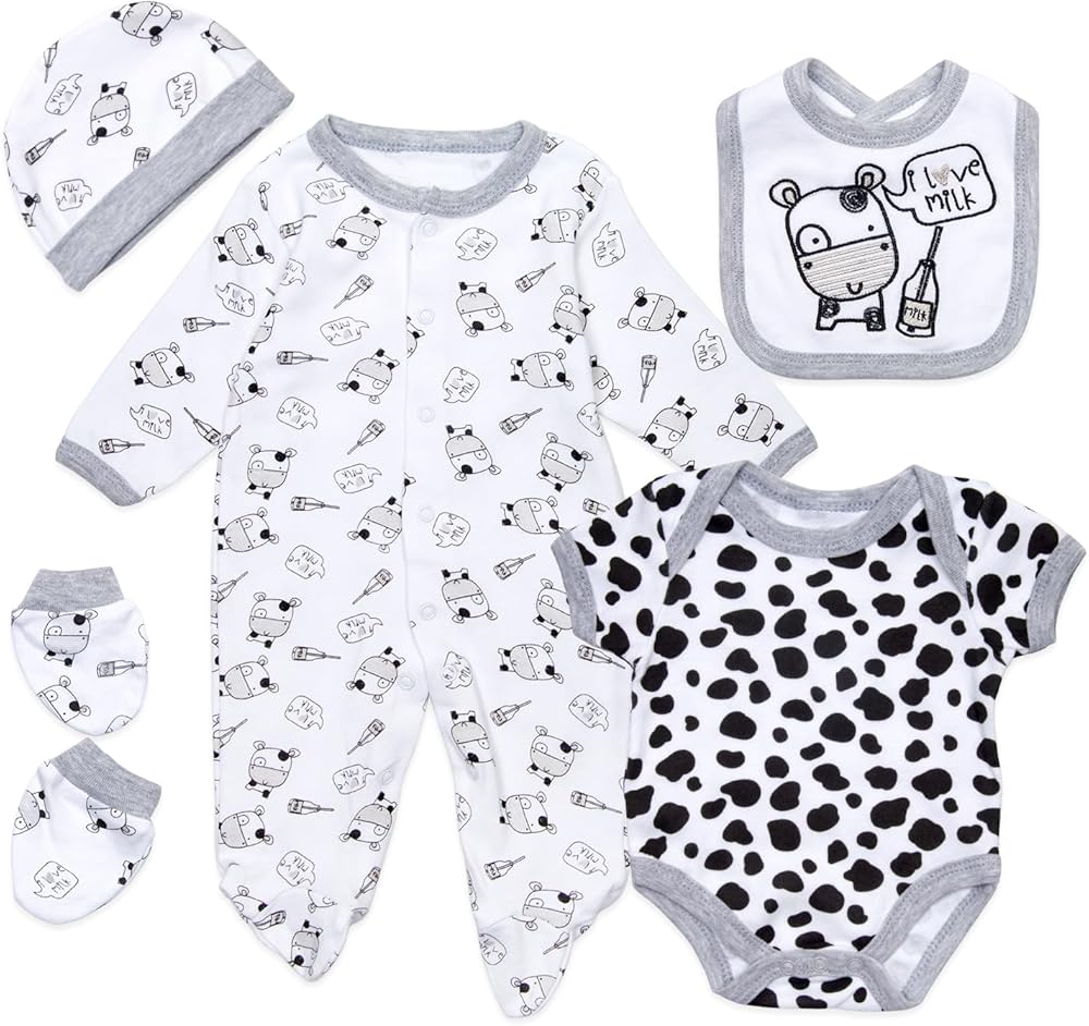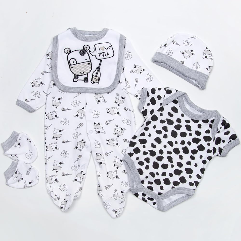 ملابس دمى الأطفال التي تولد من جديد: تعال مع سمة ماشية الألبان بدلة الزحف المرقط ، والأبقار ، والقبعة ، والمريلة ، والقفازات ، وإجمالي 5 أجهزة PC. تضيف طبقة إضافية من الدفء والراحة لهذه الدمية التي تولد من جديد.