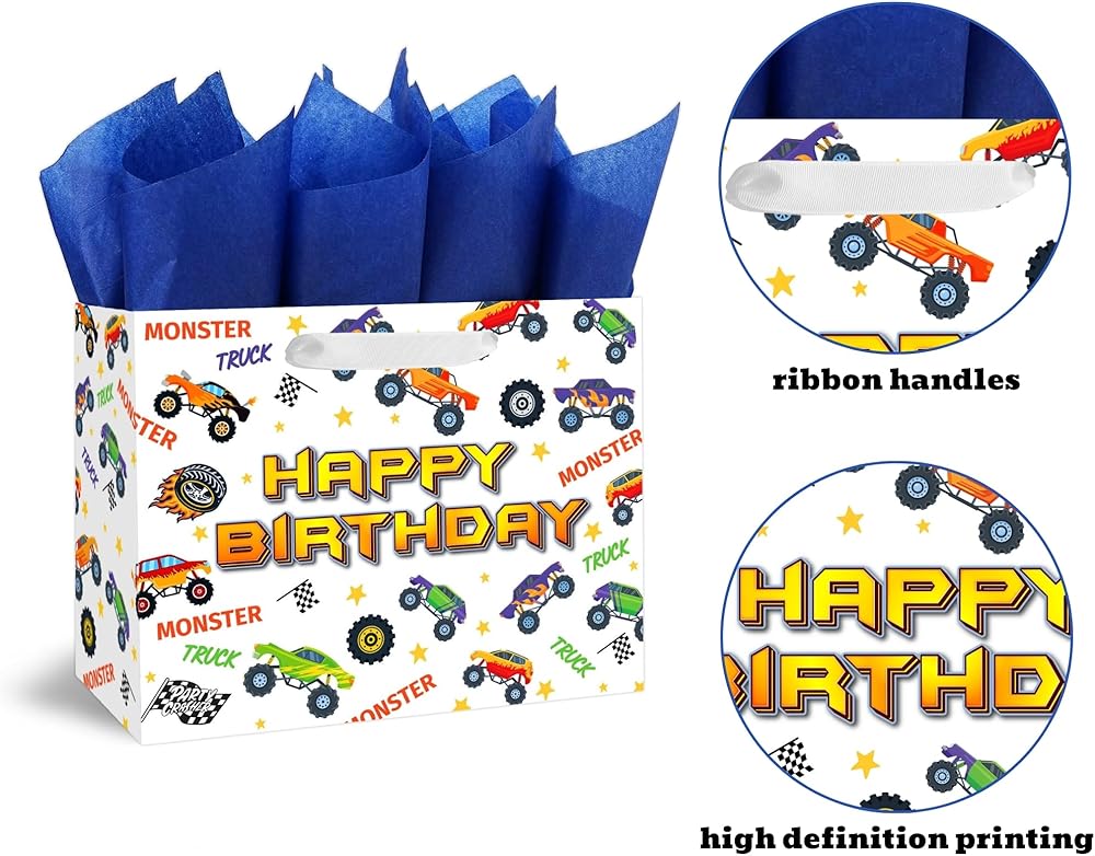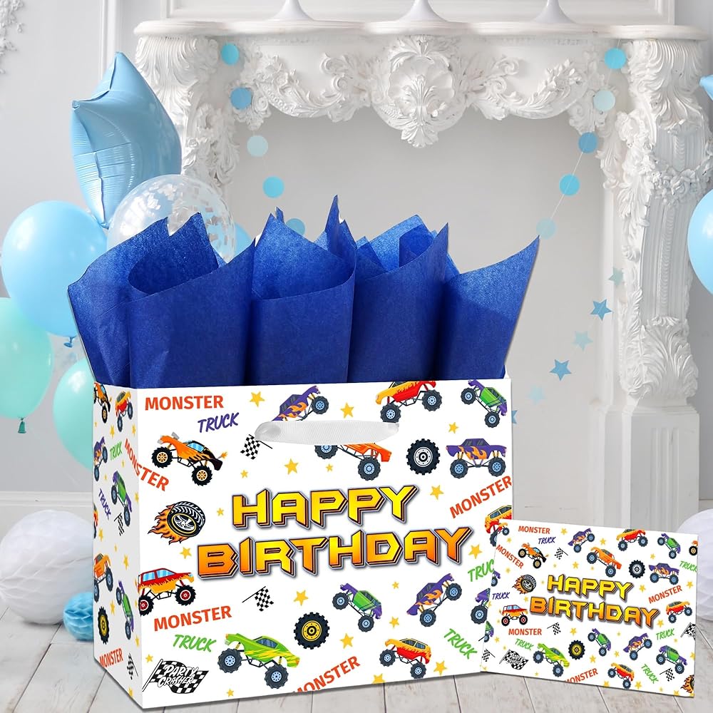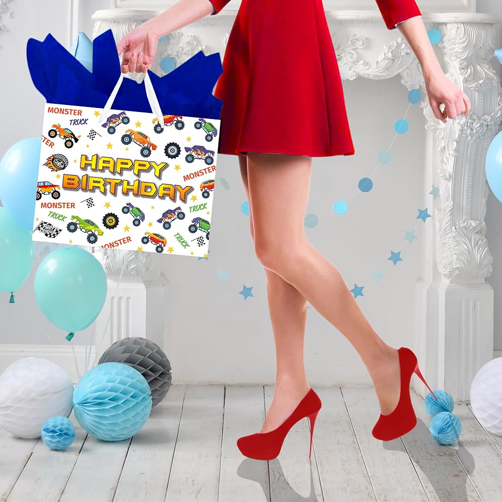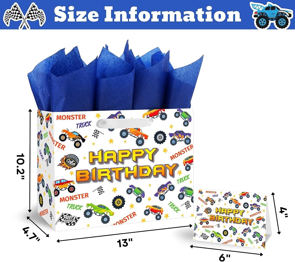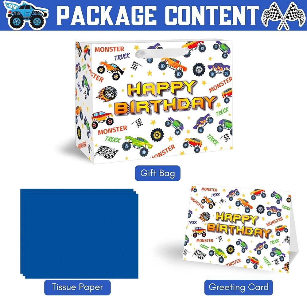 🎁 【VALUE PACKAGE】: This Birthday Gift Bag Includes one Monster Truck large gift bag, 3 sheets of Blue tissue paper, and a cute greeting card; which are perfect for the need of celebrating Birthday Parties, Kids' Birthday Parties and other special occasions for loved ones.