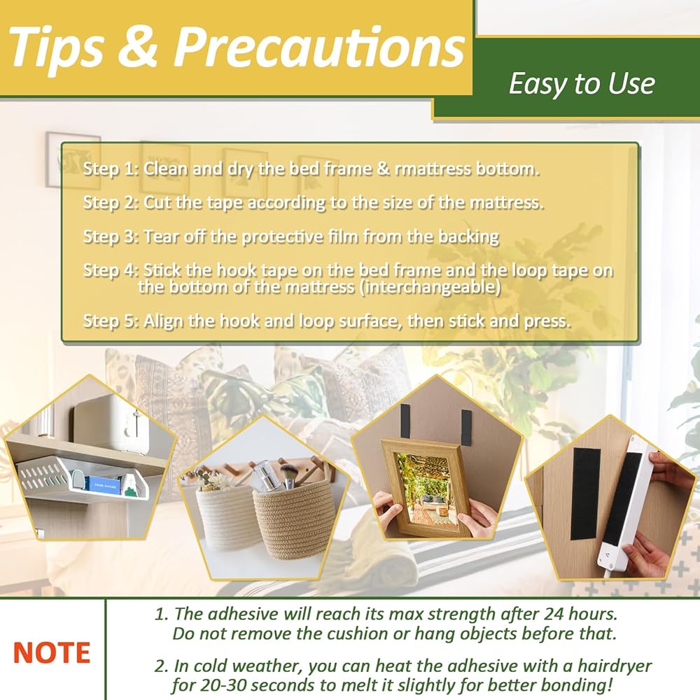 • الشريط غير المنقح متعدد الأغراض: إنه مقابض مرتبة عملي يمنع المرتبة والمزيد من الفراش من الانزلاق. يمكنك استخدامه على إطار السرير ، وأعلى المرتبة ، وألواح السرير ، وتنورات السرير ، وما إلى ذلك ، بالإضافة إلى ذلك ، فإن شريط الخطاف والحلقات مناسب لمختلف تطبيقات المنزل والمكاتب اليومية ، مثل إرفاق الستائر وسلال التثبيت وإطارات الصور المعلقة والمزيد.