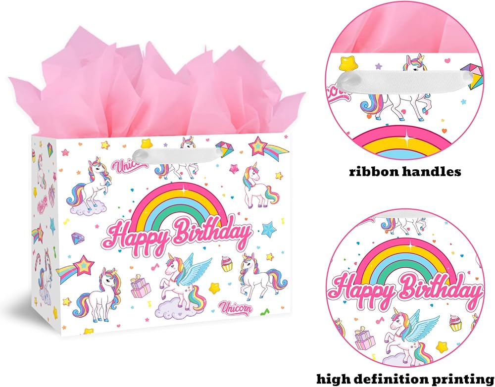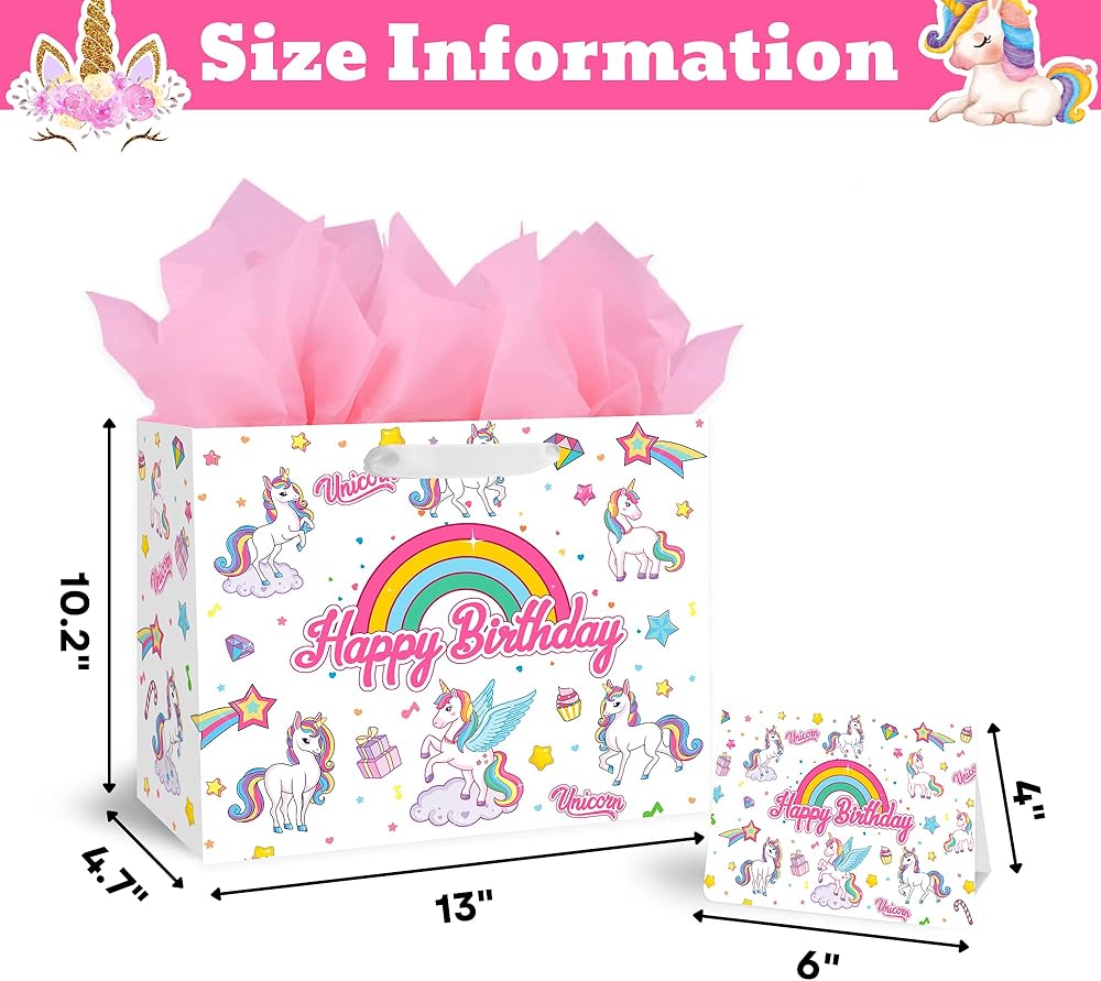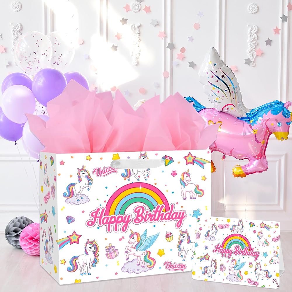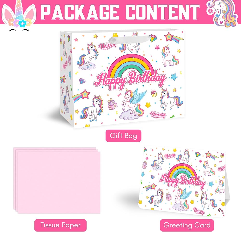 🎁 【VALUE PACKAGE】: This Birthday Gift Bag Includes one Unicorns large gift bag, 3 sheets of Pink tissue paper, and a cute greeting card; which are perfect for the need of celebrating Birthday Parties, Kids' Birthday Parties and other special occasions for loved ones.