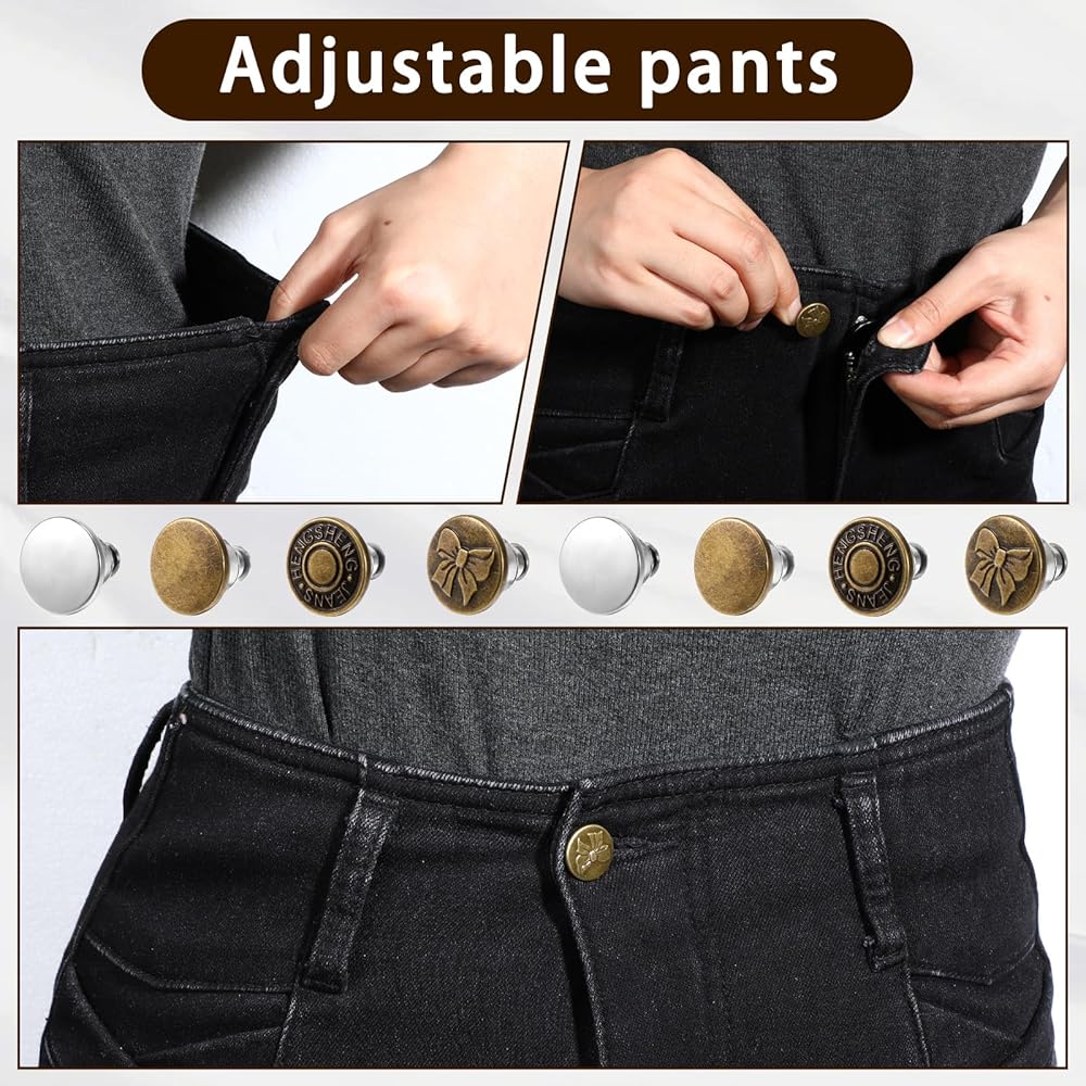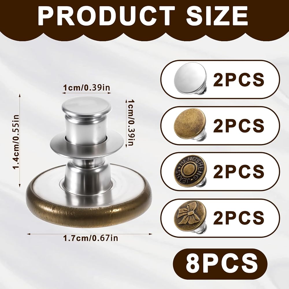 【Package Includes】You will receive 8 removable button pins for jeans in 4 styles, sufficient quantity to meet your daily use and replacement needs, ideal for making the waist of jeans smaller