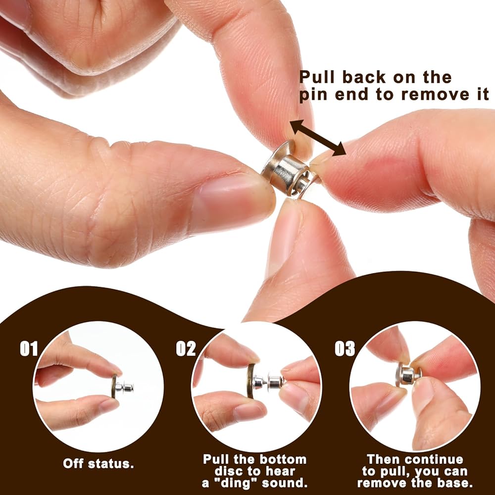 【Easy to Use】No sewing required! Simply pull the smallest circular piece to loosen, separate the tack and base, then insert the pin into the fabric and secure the base to attach the button, installation is quick and easy