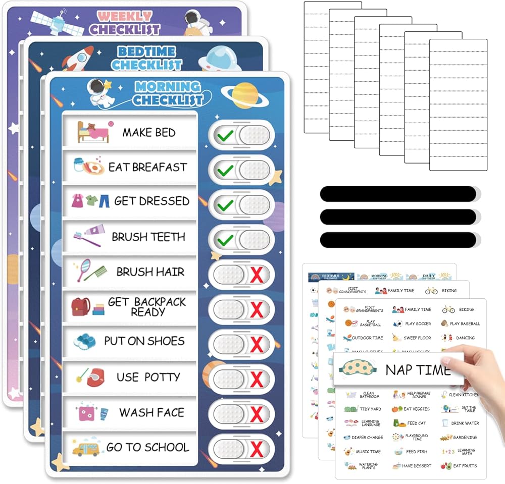 مخطط روتيني لرائد الفضاء 3 في 1 لوقت النوم/الصباح/الأسبوعي للأطفال، مخطط عمل مغناطيسي للأطفال الصغار، جدول مرئي للأطفال الصغار لوحة جدول للمنزل