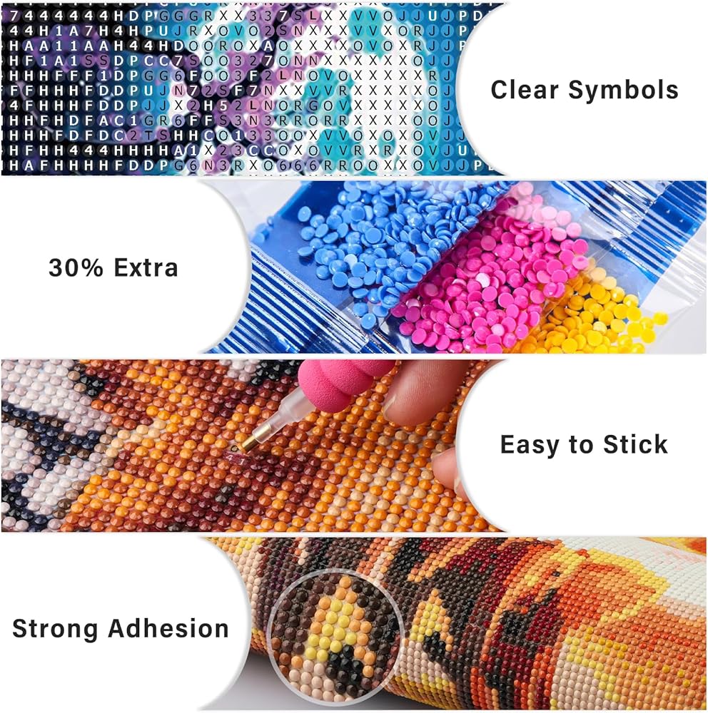 All Tools in Need Offered: Package includes 1 x HD printed canvas, 1 x pen, 1 x tray, 1 x glue clay, 5 x sealed bags and enough colorful diamonds. An extra 30% beads are provided so that the diamond painting kits can be completed smoothly