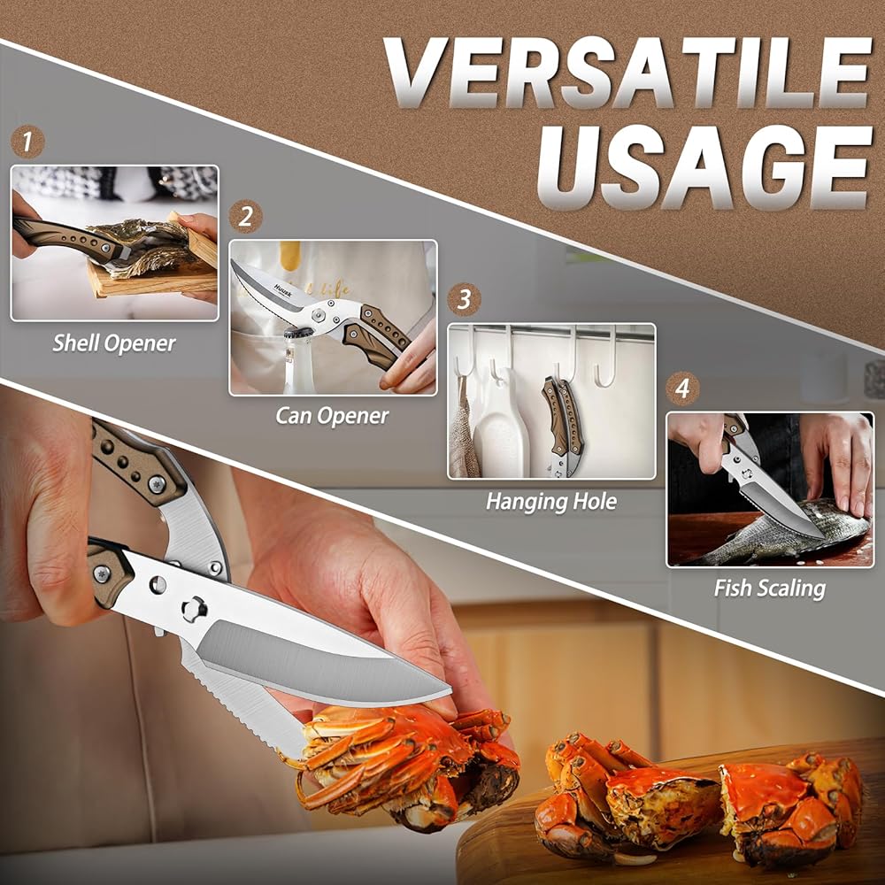 • متعدد الوظائف: يمكنك استخدام مقص قطع اللحوم متعددة الاستخدامات كافتتاح زجاجة أو فتحة قذيفة أو حتى لكشط مقاييس الأسماك. الميزات القوية والمدمجة تجعل من الصعب على مقصات الدواجن العثور على مثل هذا البديل المستدير. سواء أكان الطهي في المنزل أو التخييم والفناء الخلفي ، يمكنك إحضار مقصات اللحوم معك لسهولة التعامل معها.