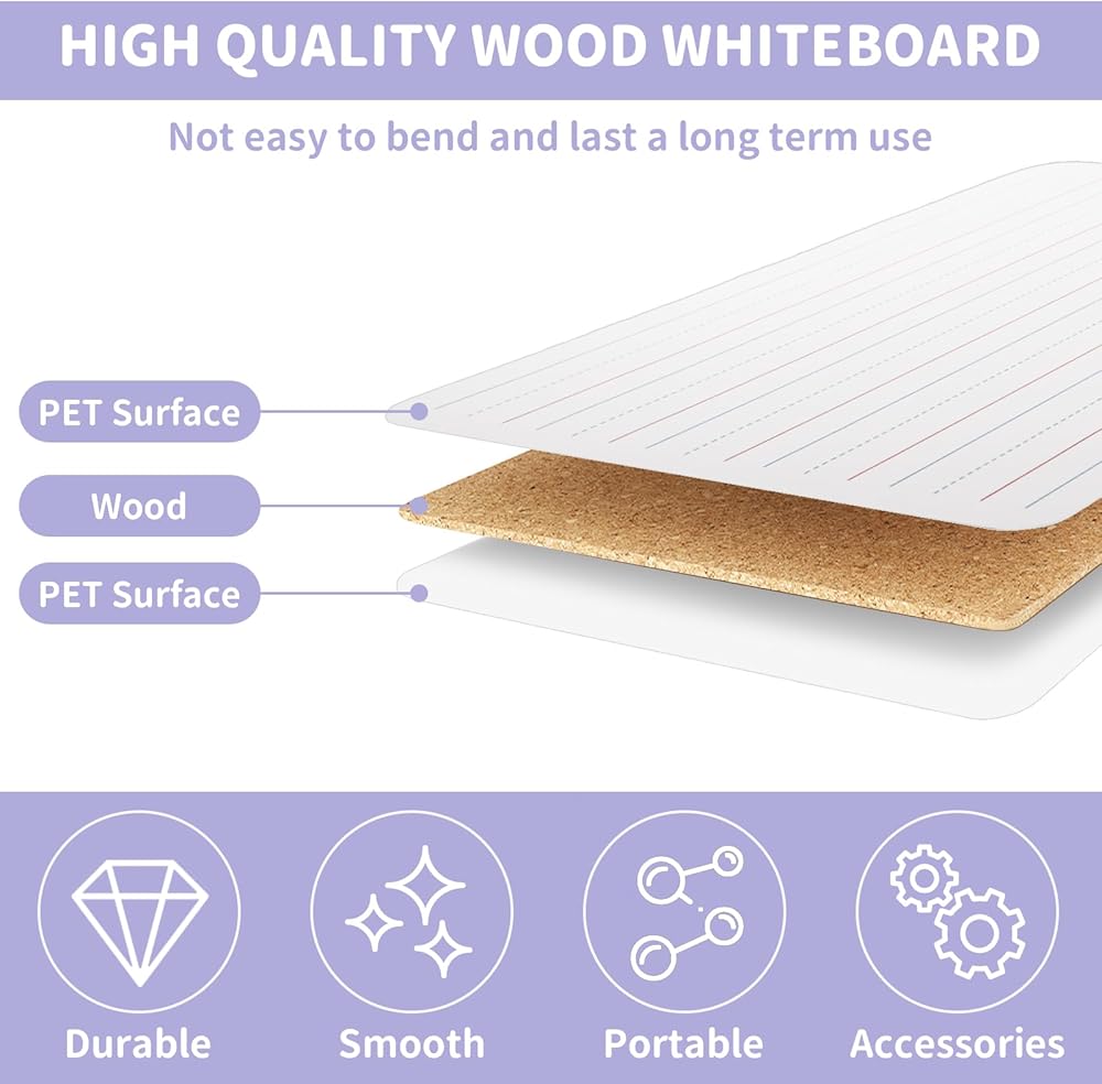 White board with lines made of high quality paper, sufficient thickness, rounded design does not hurt hands, smooth surface, easy to write and wipe; Easy to clean, after use can be wiped clean with a soft, wet cloth, for stubborn stains, with mild soap and water clean