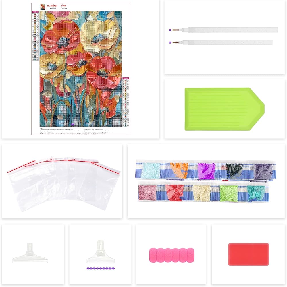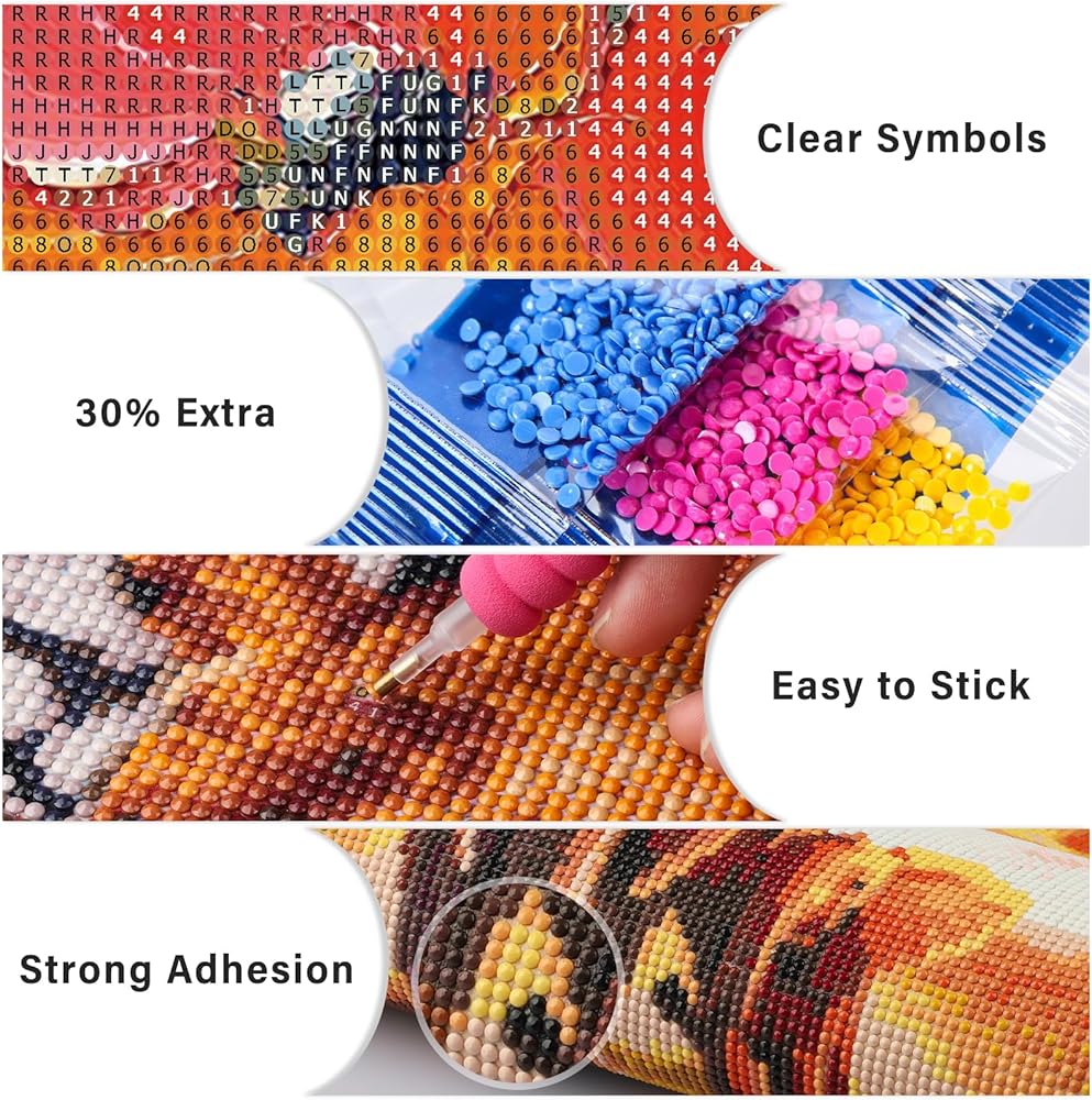 All Tools in Need Offered: Package includes 1 x HD printed canvas, 1 x pen, 1 x tray, 1 x glue clay, 5 x sealed bags and enough colorful diamonds. An extra 30% beads are provided so that the diamond painting kits can be completed smoothly