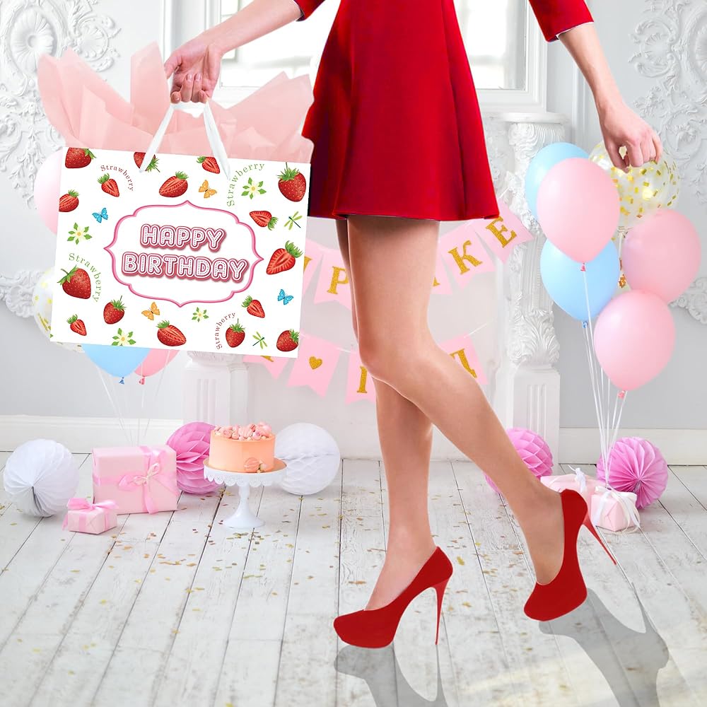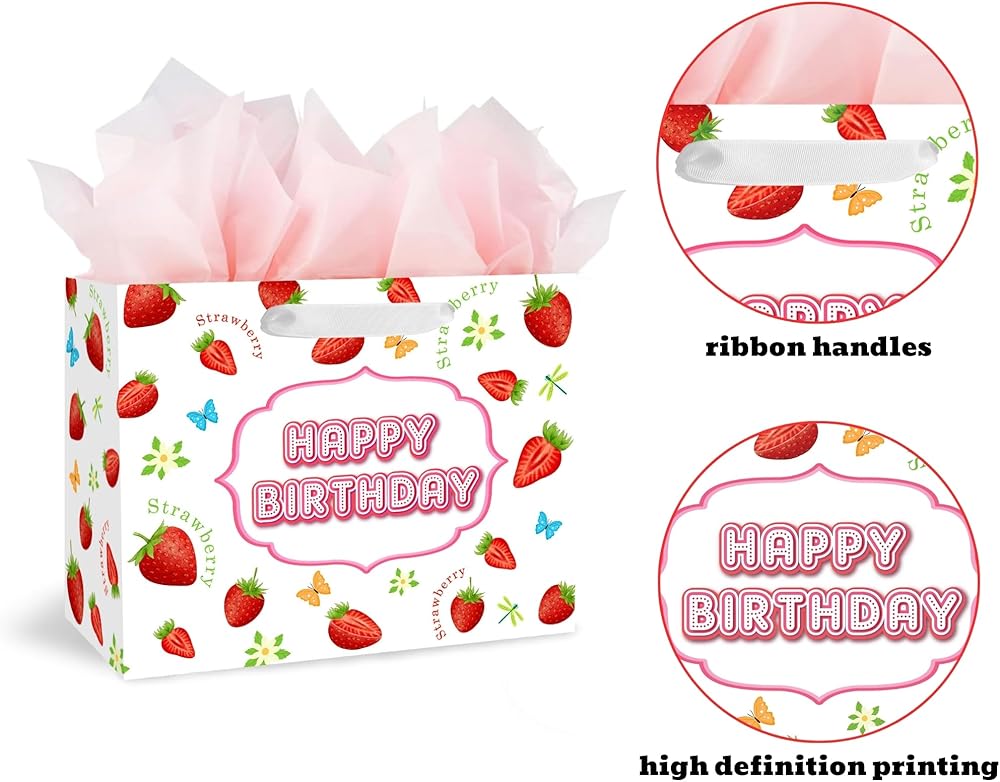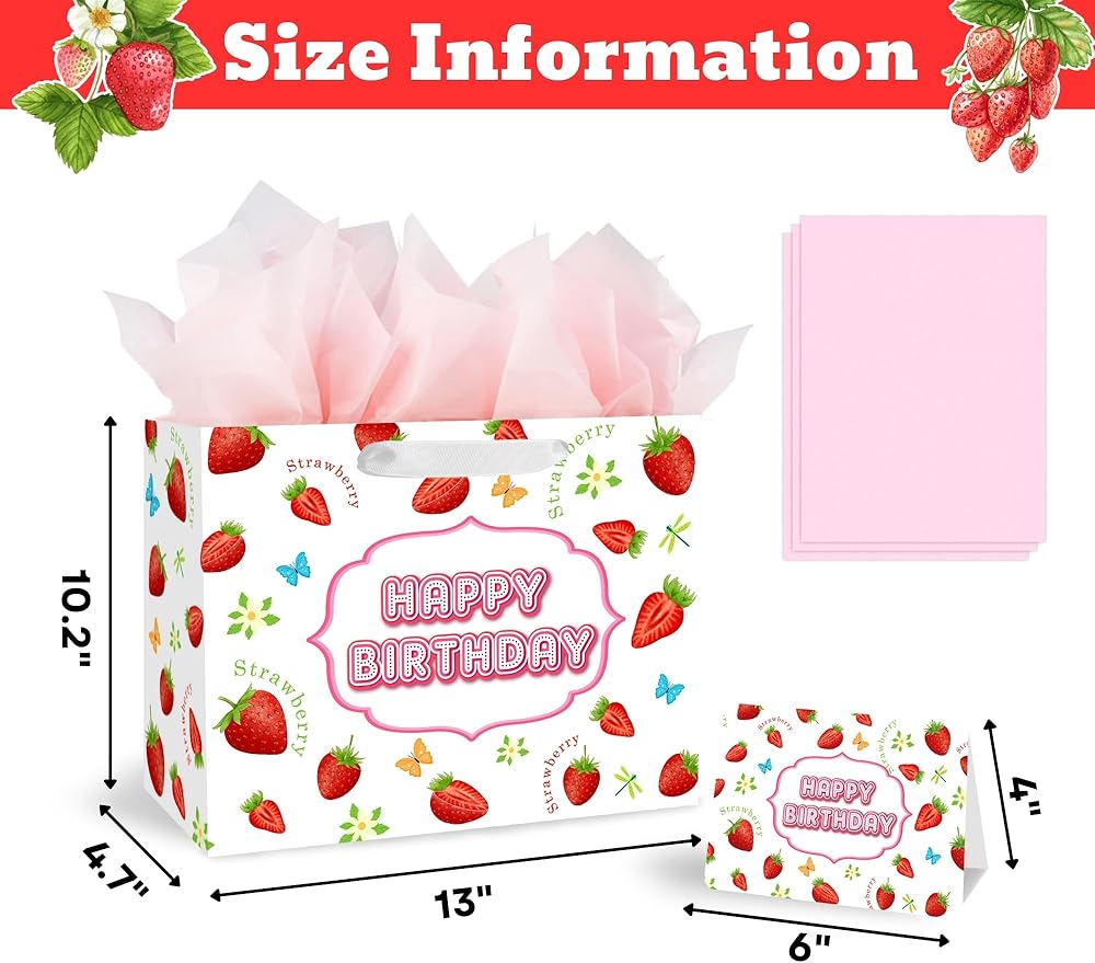 🦖【SIZE】: 13"W x 10.2"H x 4.9"D environmentally-friendly paper gift bag, with an 8"W x 6"H greeting card included, which is perfect for storing various delicate gifts, such as toys, books, puzzles, chocolates, snacks and so on. 🎁 【VALUE PACKAGE】: This Birthday Gift Bag Includes one Sweet Strawberry large gift bag, 3 sheets of Pink tissue paper, and a cute greeting card; which are perfect for the need of celebrating Birthday Parties, Kids' Birthday Parties and other special occasions for loved ones. 🦕 【Strawberry DESIGN】: Featuring a delightful and vibrant Strawberry wrapping paper theme party, this birthday gift bag boasts a sturdy ribbon handle for added charm. 🎀 【SUPER CONVENIENT】: A superb alternative to traditional gift wrapping, the baby gift bag can easily hold your gift and show your care. 🔧 【SERVICES】: Enjoy 24-hour professional customer service for prompt issue resolution; backed by our money-back guarantee for your peace of mind.