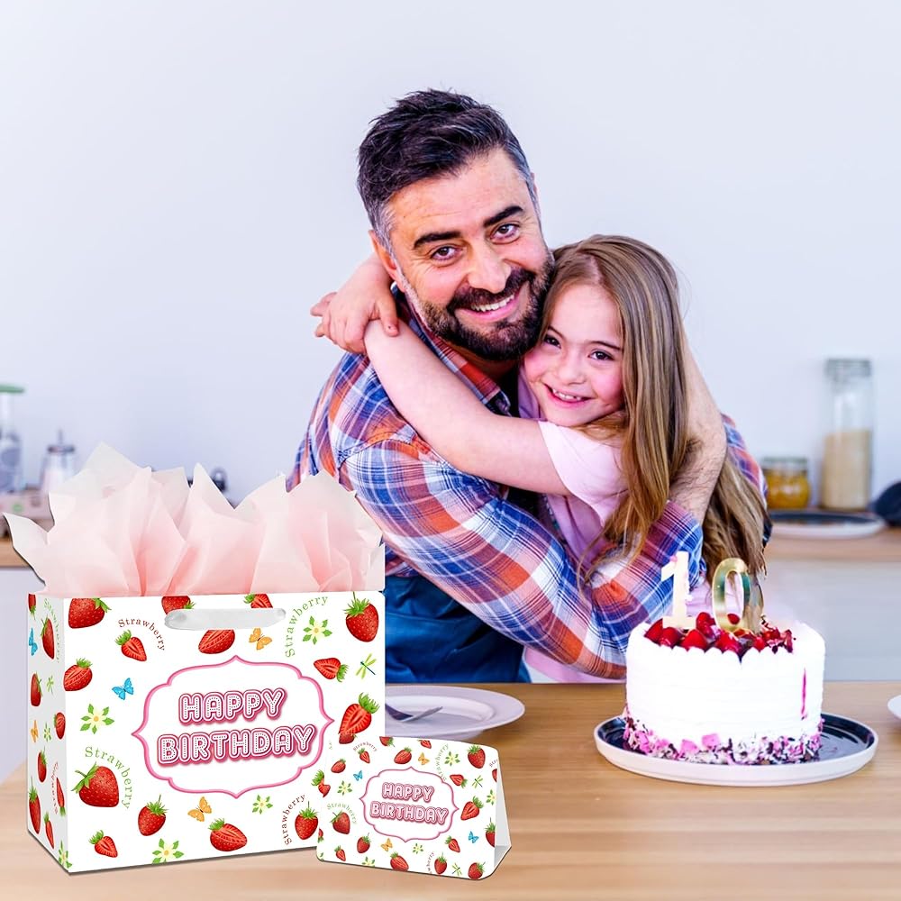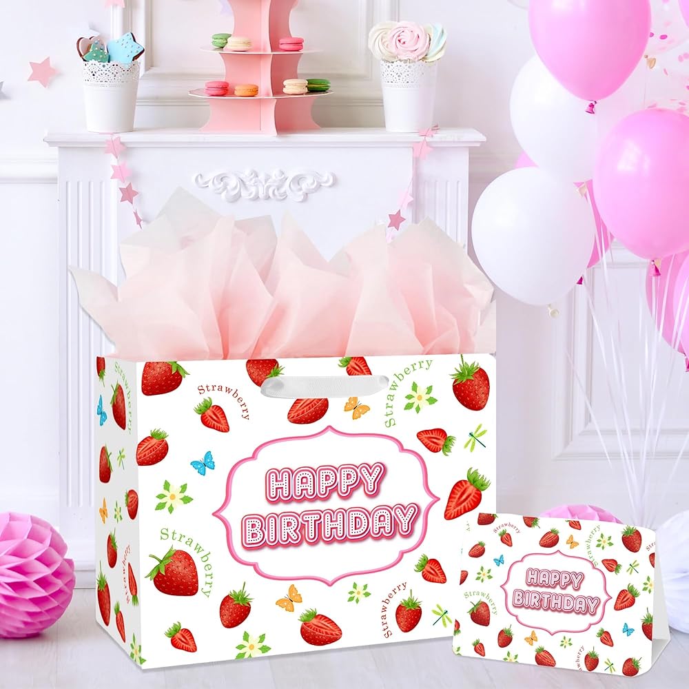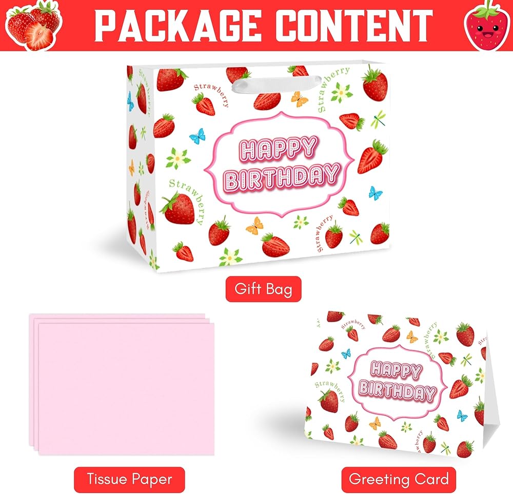 🎁 【VALUE PACKAGE】: This Birthday Gift Bag Includes one Sweet Strawberry large gift bag, 3 sheets of Pink tissue paper, and a cute greeting card; which are perfect for the need of celebrating Birthday Parties, Kids' Birthday Parties and other special occasions for loved ones.