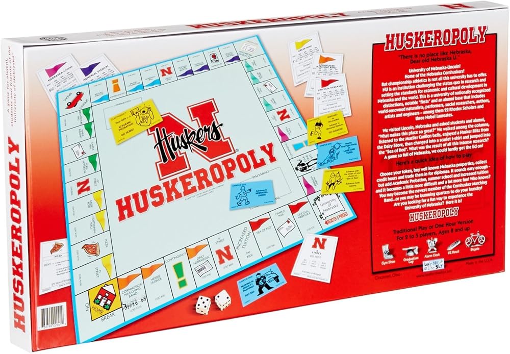Enjoy this themed monopoly style game with a Husker twist. Fun and educational. Collegiate theme. Recognize your favorite places and tokens.