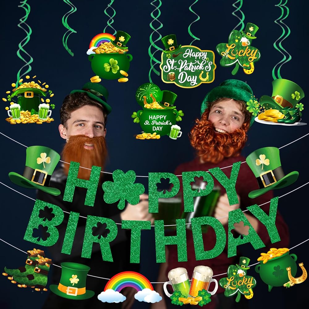 • التصميم: تعد شعار عيد ميلاد Green St. Patrick's Day و Dovirls المعلق في ظلال من اللون الأخضر والذهبي هو المكمل المثالي لمستلزمات حفلات عيد القديس باتريك الأخرى ، مثل البالونات والمناديل وملفات المائدة.
