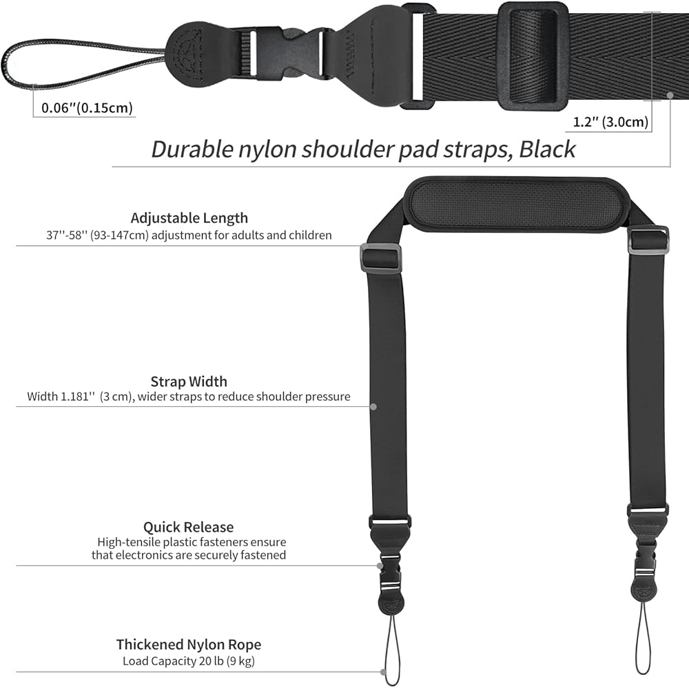 • حزام عنق الكاميرا الموثوق به: حزام الكاميرا مصنوع من نايلون منسوج عالي الجودة من أجل متانة ممتازة. لا تقاوم هذه المادة تآكل الاستخدام اليومي فحسب ، بل إنها أيضًا قابلة للتنفس وسهلة التنظيف ، مما يضمن الاستخدام الطويل الأجل الموثوق به.