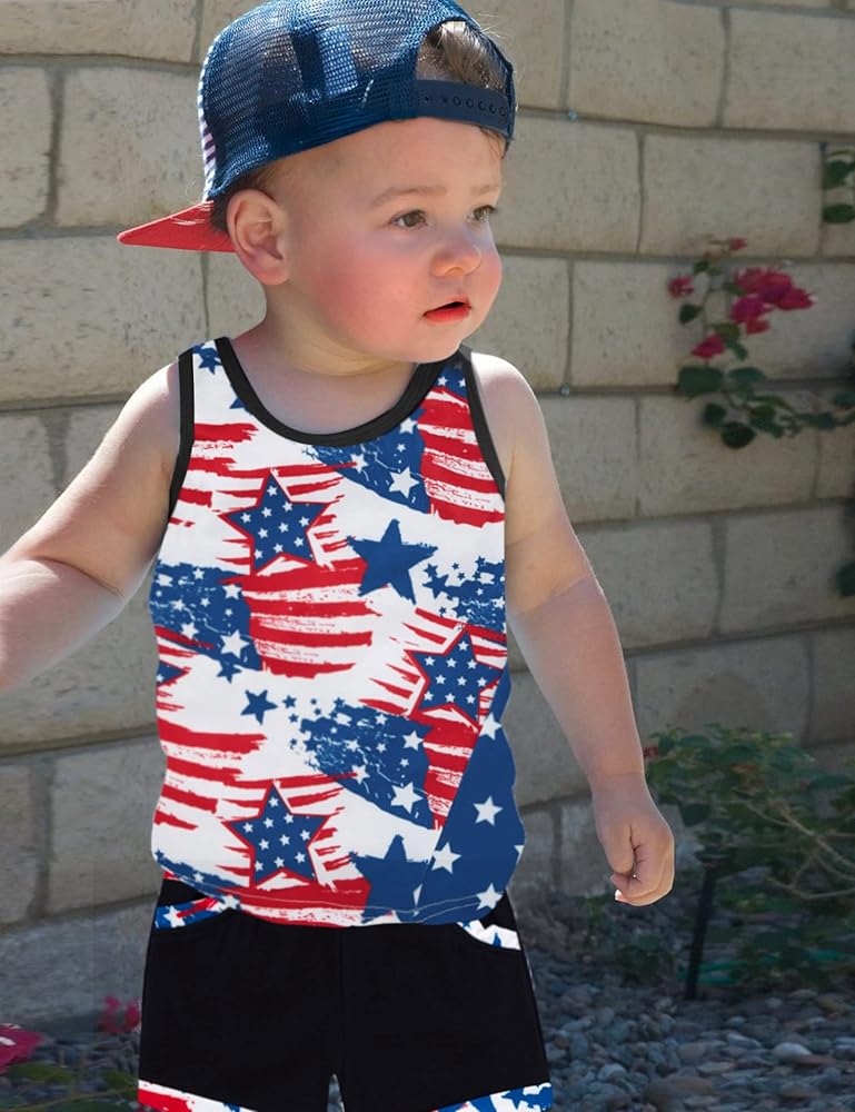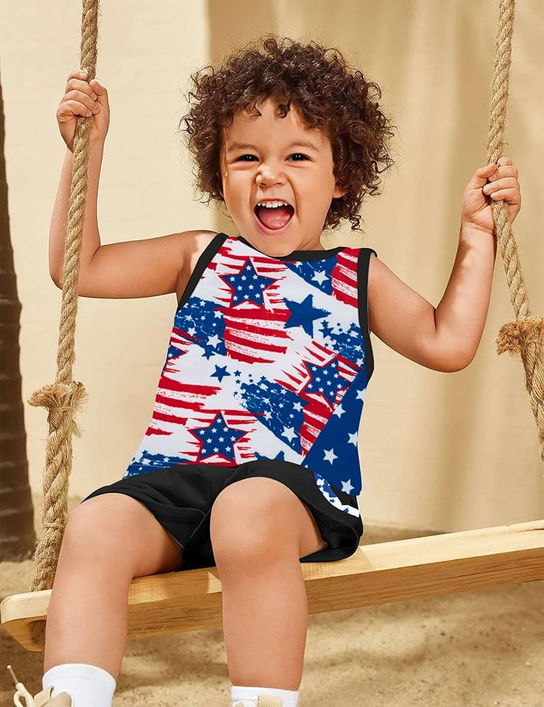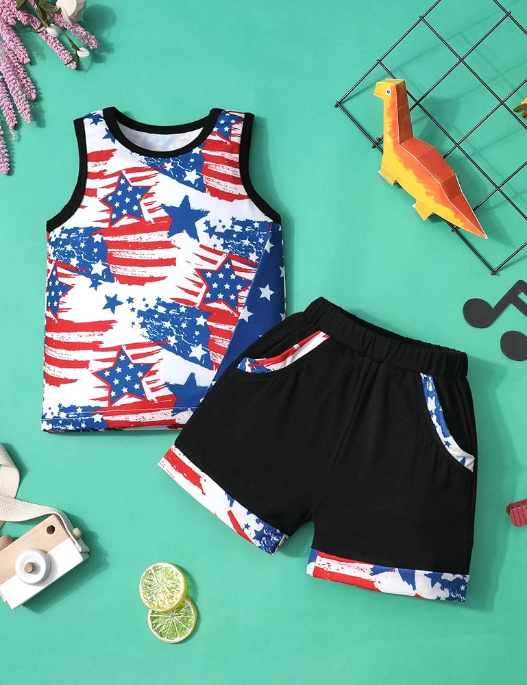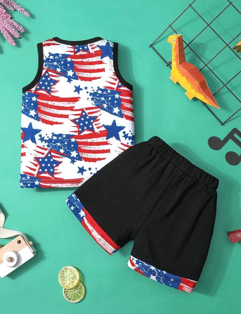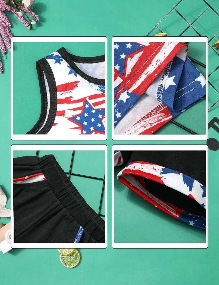 🌠【 احتفل بيوم الاستقلال】 يتم طباعة قمة القميص بلا أكمام مع النجوم والخطوط من العلم الأمريكي ، وتتمتع السراويل القصيرة السوداء ببعض الصبغ في ألوان العلم الأمريكي. هذا هو الزي المثالي لصبي باتريوت.