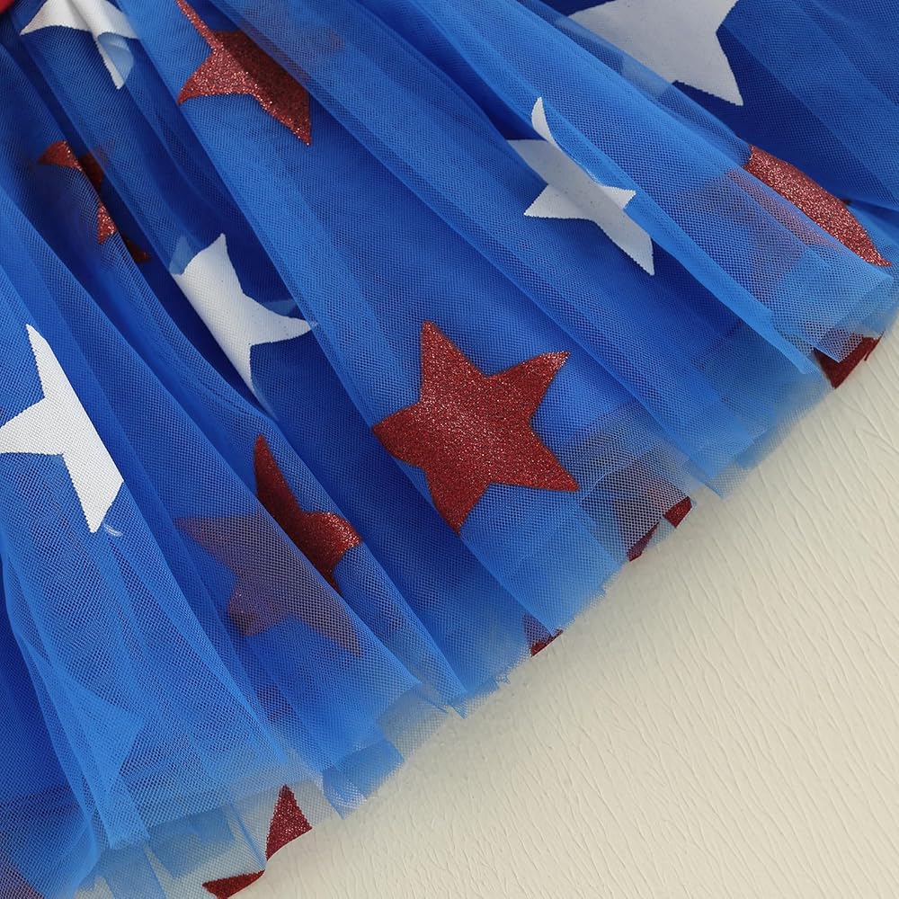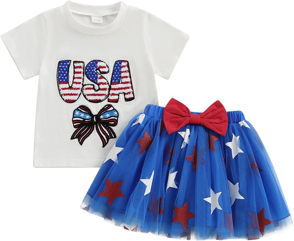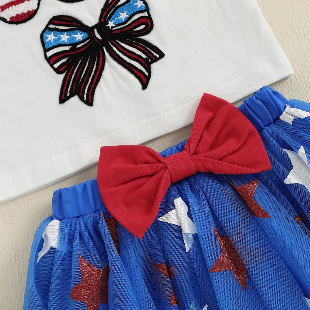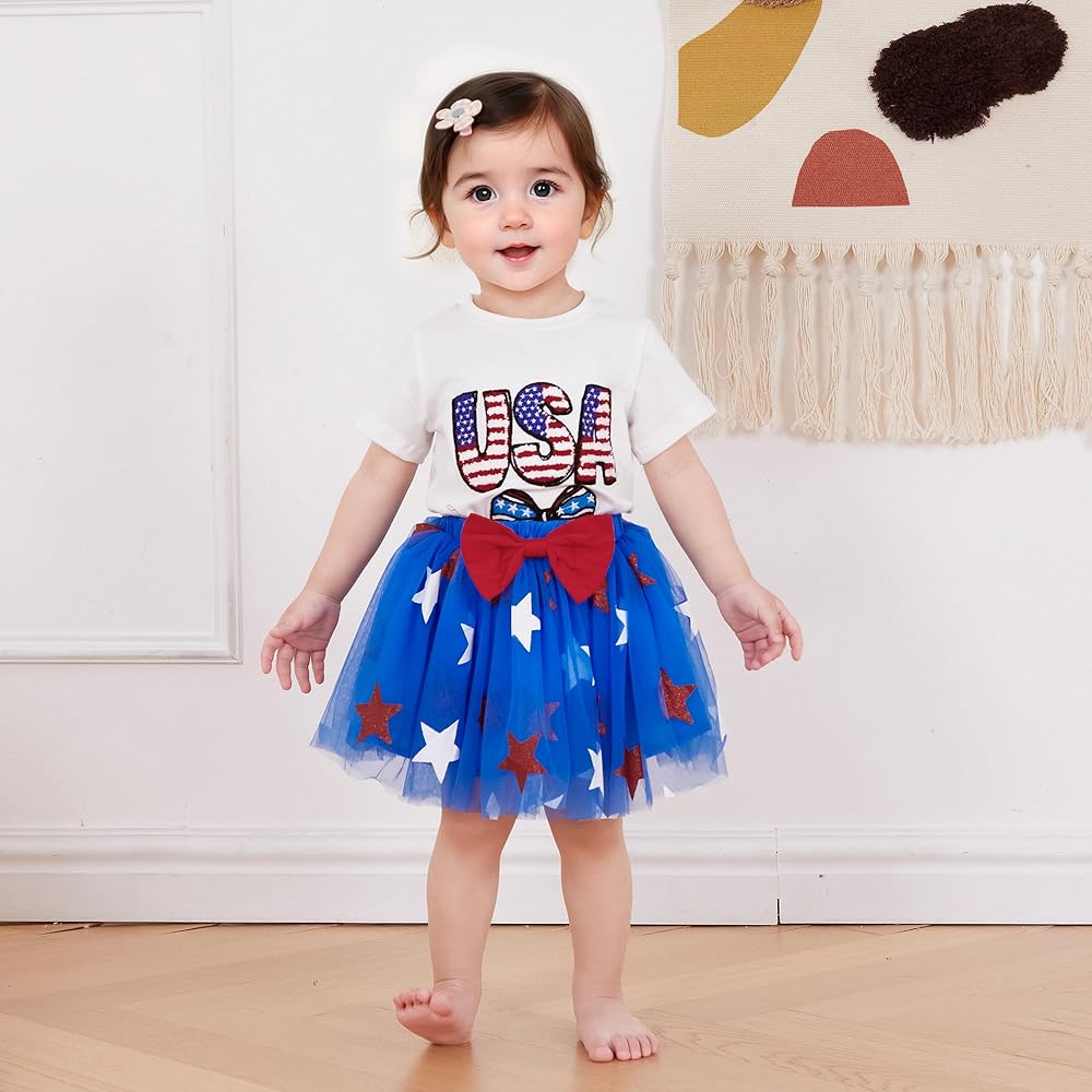 Design: 4th of july outfits for girls, including round neck, short sleeve, letter and bow pattern tops, and elastic waistband tulle skirts with glitter star, are designed for child to show off their patriotic spirit in style
