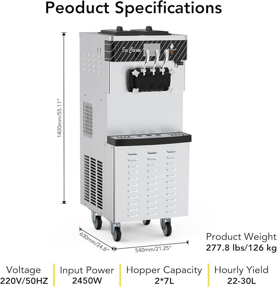 الإنتاجية العالية: مع وجود نطاطات مزدوجة من الفولاذ المقاوم للصدأ بحجم 1.85 جالون (7 لتر) ، يمكن أن تنتج بشكل فعال من 5.8-8 جالون (22-30 لتر) من الآيس كريم في الساعة. تفي هذه السعة الكبيرة التي تعمل بها الآيس كريم وإنتاجية عالية الإنتاجية إلى متطلبات متاجر الوجبات الخفيفة والمطاعم.