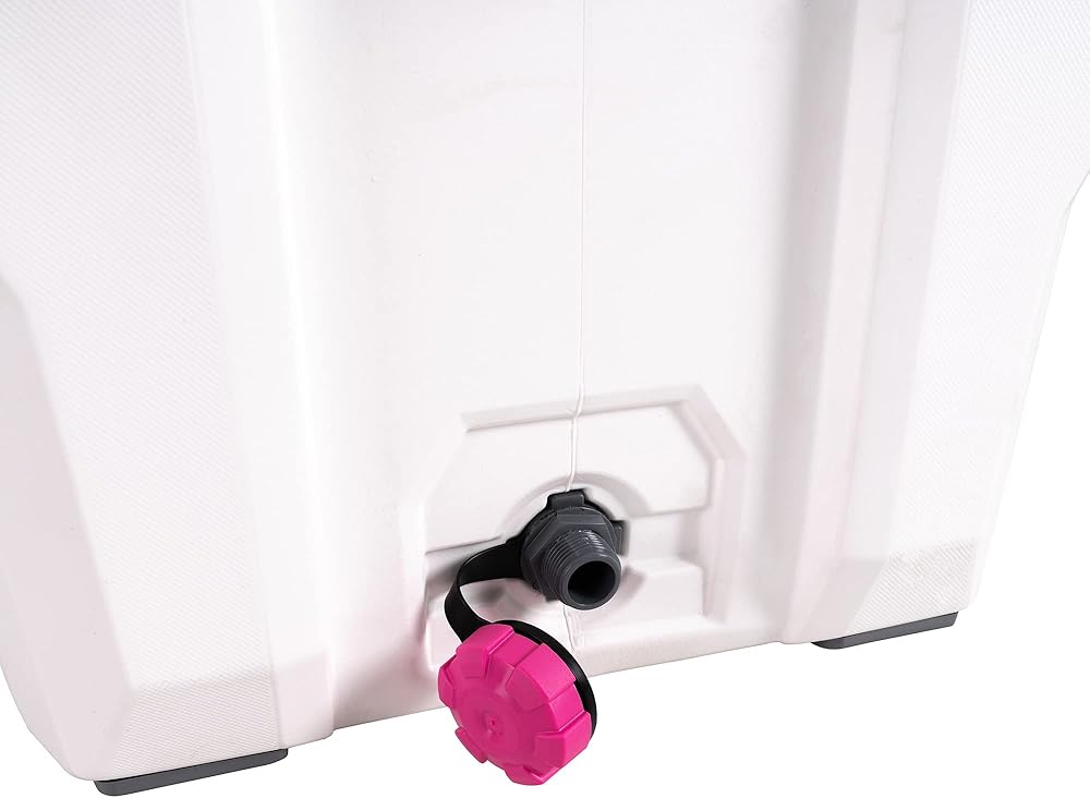 CAPPED DRAIN: Easy-to-Drain Spout with Garden Hose Compatibility | ADDITIONAL FEATURES: (2) rope handles with comfortable grips, (4) feet that are serviceable, (2) latches that secure lid, and a stainless steel bottle opener with padlock compatibility (lock not included)