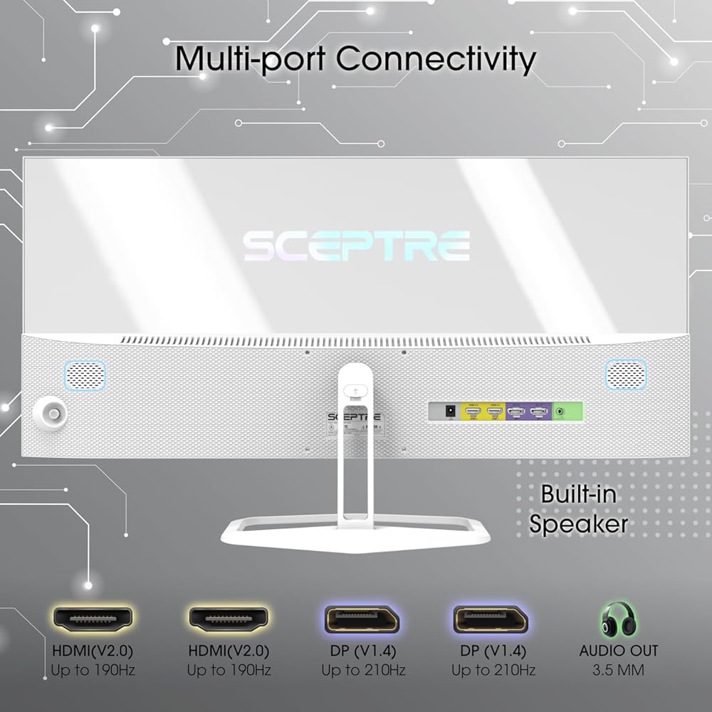 Introducing the Sceptre E305B-FU200TW Ultrawide Gaming Monitor - Unleash the Power of Seamless Play! Elevate your gaming experience to new heights with the Sceptre Ultrawide Gaming Monitor. Designed for the modern gamer who demands top-tier performance, this cutting-edge monitor delivers a visual feast that goes beyond ordinary displays. Boasting a 30-inch 2560x1080 display, witness every detail come to life in stunning high definition. Whether you're navigating intense battlegrounds or exploring vast virtual landscapes, the vibrant colors and sharp contrasts will keep you at the edge of your seat. Bid farewell to stuttering and tearing. The E305B features a lightning-fast refresh rate of 210Hz and a swift response time of 1ms BR, ensuring buttery-smooth gameplay without a hint of motion blur. Immerse yourself in the action as this monitor keeps pace with the most demanding gaming scenarios. Get lost in the game with the IPS panel's immersive deep colors displayed in an ultrawide format. The immersive colors will pull you deeper into the heart of the action. It's not just a monitor; it's a portal to another dimension. Stay ahead of the competition with our built-in AMD FreeSync technology. Experience tear-free gaming with flawless synchronization between the monitor and your graphics card. The E305B ensures that every frame is delivered with precision, giving you the competitive edge you need. Crafted with a sleek and modern aesthetic, the E305B not only performs like a champion but looks the part too. The slim bezels maximize your viewing area, and versatile connectivity options, including 2 x HDMI and 2 x DP, make it a seamless fit for your gaming setup. Upgrade your gaming rig with the E305B-FU200TW Ultrawide Gaming Monitor – where style meets performance, and victory meets pixels. Elevate your gaming experience today!