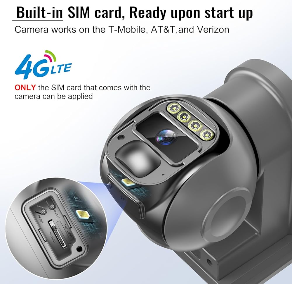 【Built-in 4G LTE SIM card 】Our package includes a built-in prepaid 4G LTE SIM card with 100MB trial data. Unlimited data plans can be renewed at $14.9 monthly to $149.9 yearly per camera(other data plans available) within the app. Additionally, please note that the camera can only be used in the US and the SIM card supports AT&T, T-Mobile, and Verizon networks. Only the SIM card that comes with the camera can be applied.