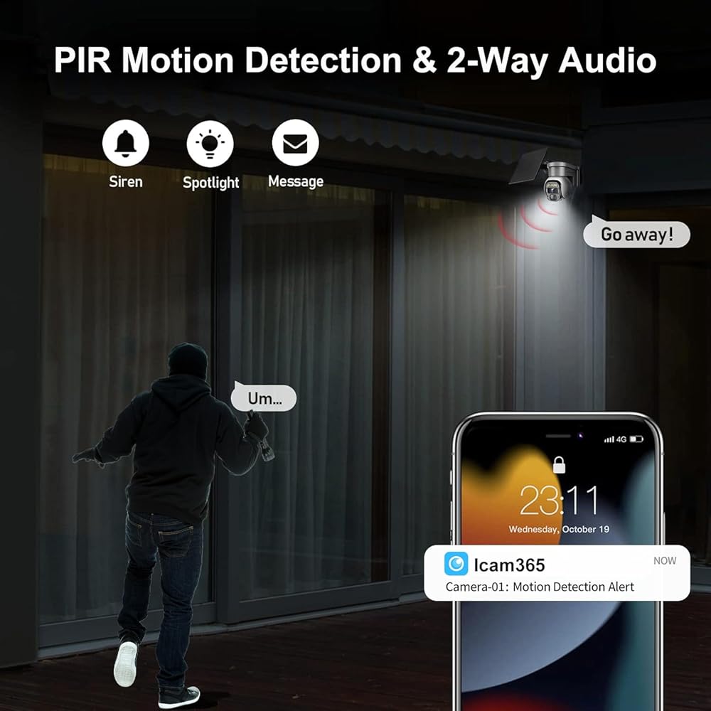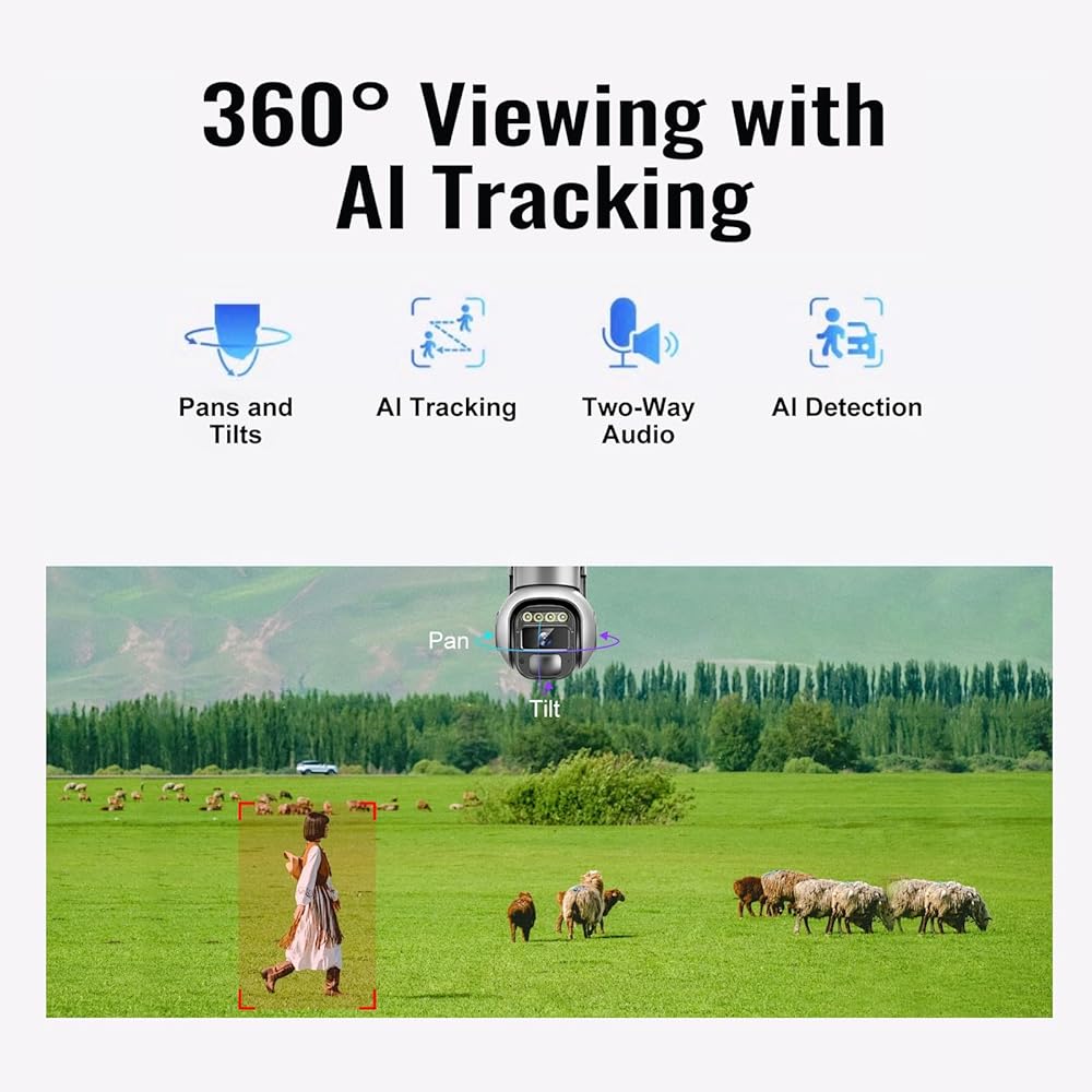 【2.5K FHD Color Night Vision, 360° Pan and Tilt Control】The solar camera cellular offers 2.5K high resolution with 4X digital zoom, With Infrared & Led light,Even in the dark, the full-color night vision lets you always keep an eye on your assets..This outdoor cameras for home security support 355° horizontal and 90°vertical rotation to keep 360-degree panoramic view