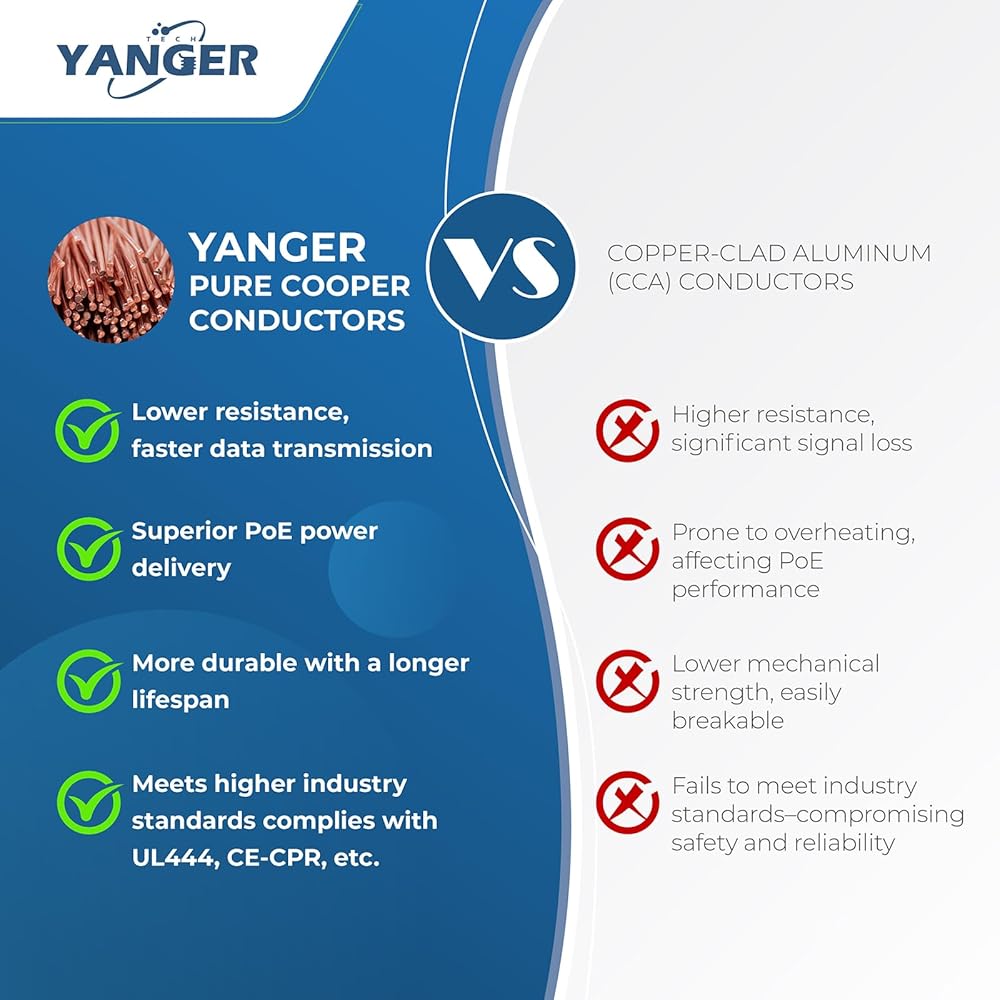 • متوافق مع أجهزة POE ++ - يضمن النوى النحاسية النقية الموصلية الممتازة ، وفقدان الإشارة الحد الأدنى ، وتقليل توليد الحرارة مقارنة ببدائل الألومنيوم المغطاة بالنحاس (CCA). مثالي للتركيبات طويلة المسافات مع أداء مستقر لأجهزة POE مثل كاميرات IP وهواتف VoIP وأجهزة التوجيه الشبكية ونقاط الوصول إلى Wi-Fi. ترقية سلسة من أنظمة CAT5 الأقدم.