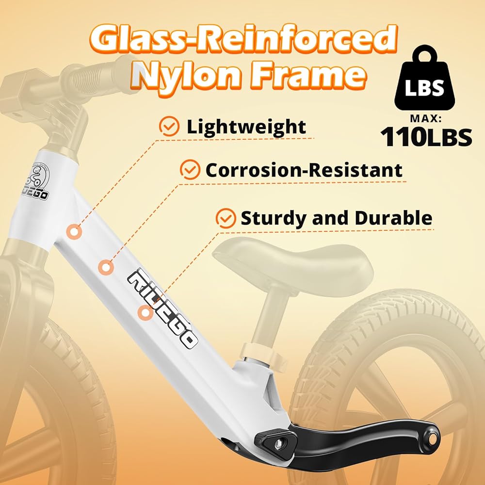 【إطار خفيف الوزن ودائم】 تم تصميمه بإطار نايلون مقوى بالزجاج ، توفر دراجة التوازن هذه نفس القوة التي تصل إليها الفولاذ الكربوني بسعة وزن تصل إلى 110 رطلاً ، بينما تزن 8.16 رطل فقط. كما أنه أكثر مقاومة للتآكل وخفيفة الوزن. تم تصميمه من أجل الأداء طويل الأمد ، من السهل على الأطفال التعامل معهم والآباء.