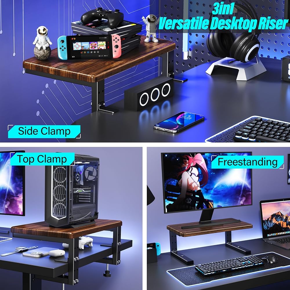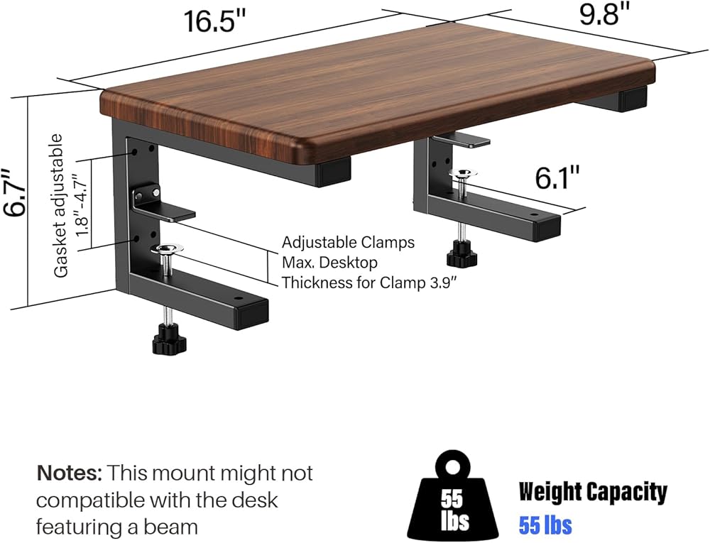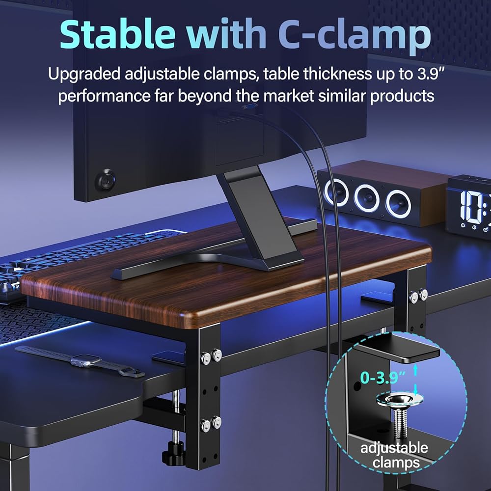 متين C-clamps: لا يسهل تثبيت اثنين من المشاهدين C متين فقط ، ولكن أيضًا يربطان بشكل آمن على سطح المكتب. يمكن تثبيتها ويمكن تحويلها إلى الداخل إلى حافة سطح المكتب ، مما يضيف منصة عالية 16.5 × 9.8 "ومساحة تخزين إضافية ، مثالية لعقد أجهزة الكمبيوتر المحمولة والشاشات