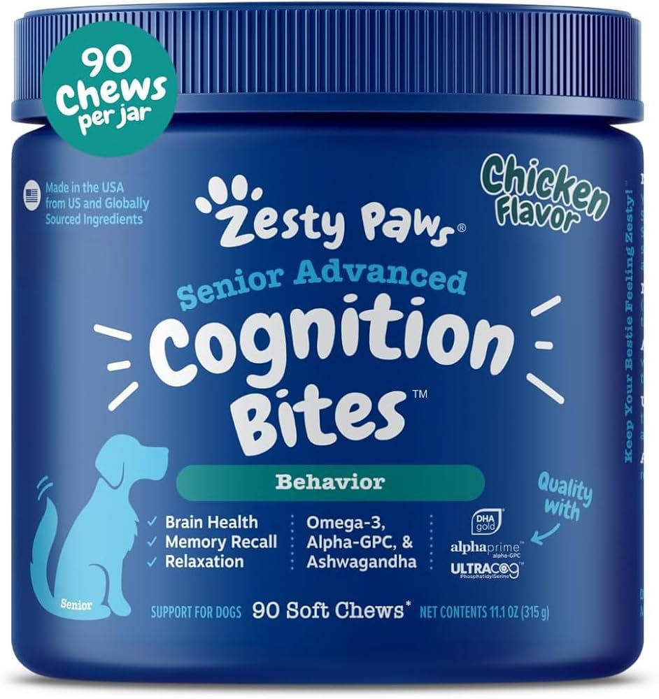 ابق حادة ، فيدو! - Zesty Paws لدغات الإدراك المتقدم عبارة عن مكملات قابلة للمضغ مع مكونات متميزة تساعد في الوظيفة الإدراكية والتوتر والوضوح والتركيز على رفيقك الكلاب