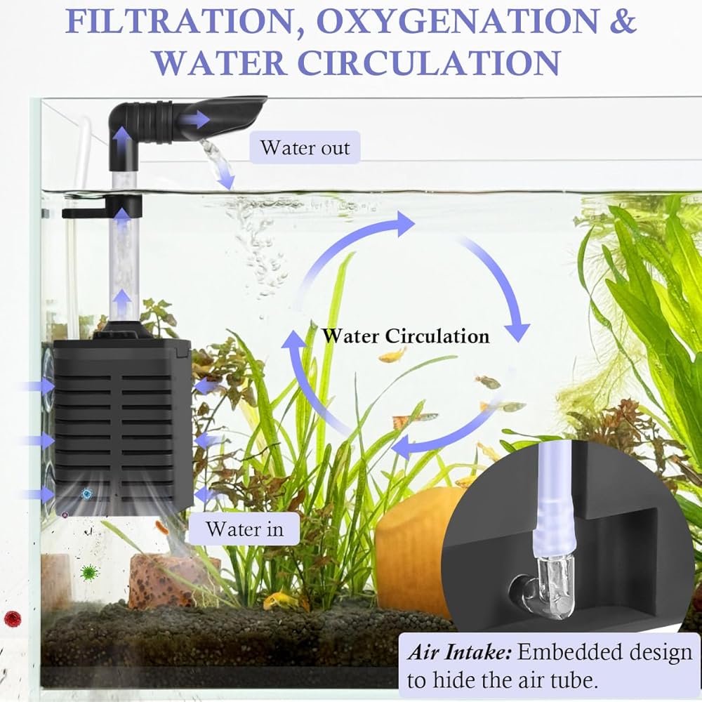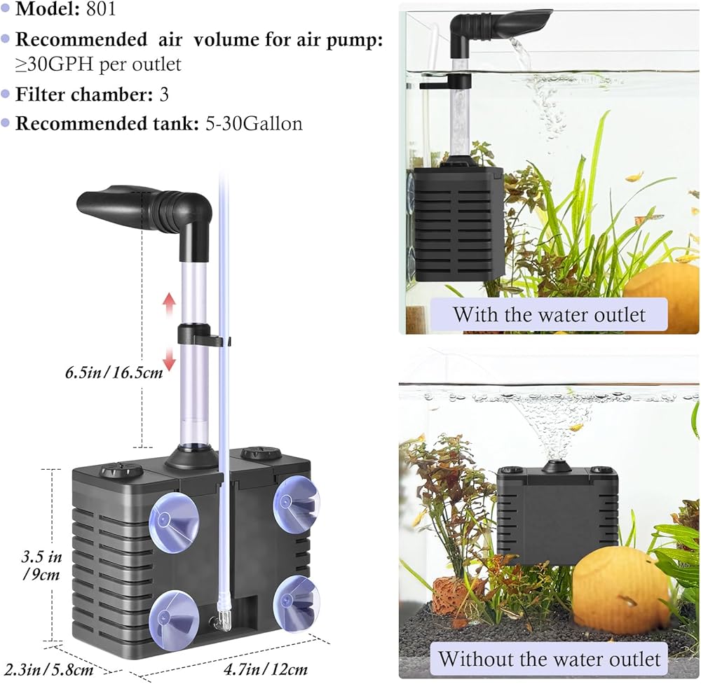 【تصميم تم ترقيته】 أكواب الشفط 4 القوية تعمل بحزم على مرشح على جدار الحوض ومنعه من الانزلاق. مداخل المياه على الجانب أقل من 0.01in ولن تمتص الأسماك الصغيرة. أيضا ، يمكن ضبط أنبوب التلسكوبي ومنفذ الماء بحرية.