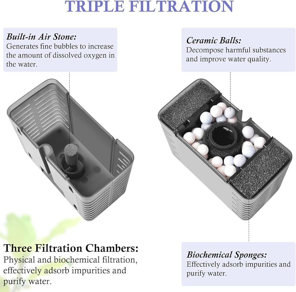 【الاستخدام والصمت】 يوفر مرشح الإسفنج خيارين للاستخدام. يمكنك اختيار استخدامه مع أو بدون منافذ المياه المرفقة. يمكن استبدال وسائط المرشح الداخلي بحرية حسب الحاجة. يعمل مرشح الحوض الصغير هذا بهدوء شديد ، ولا يمكنك سماع أي صوت من المرشح نفسه أثناء العمل.