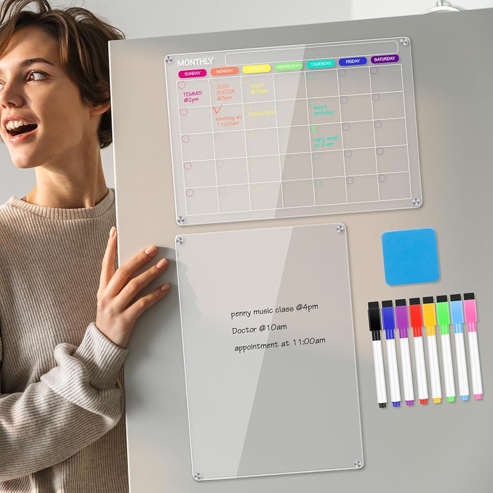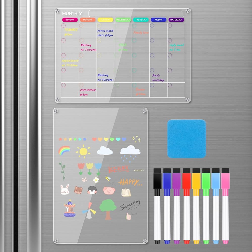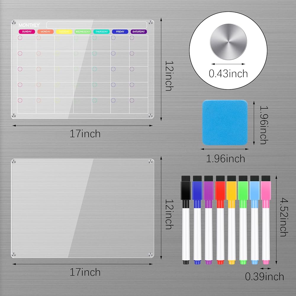 • Package Contents: You will receive 1 pcs acrylic refrigerator calendar board, 1pcs acrylic refrigerator blank board, 8 pcs magnetic dry erase marker with 8 bright colors, 1pcs magnetic eraser.